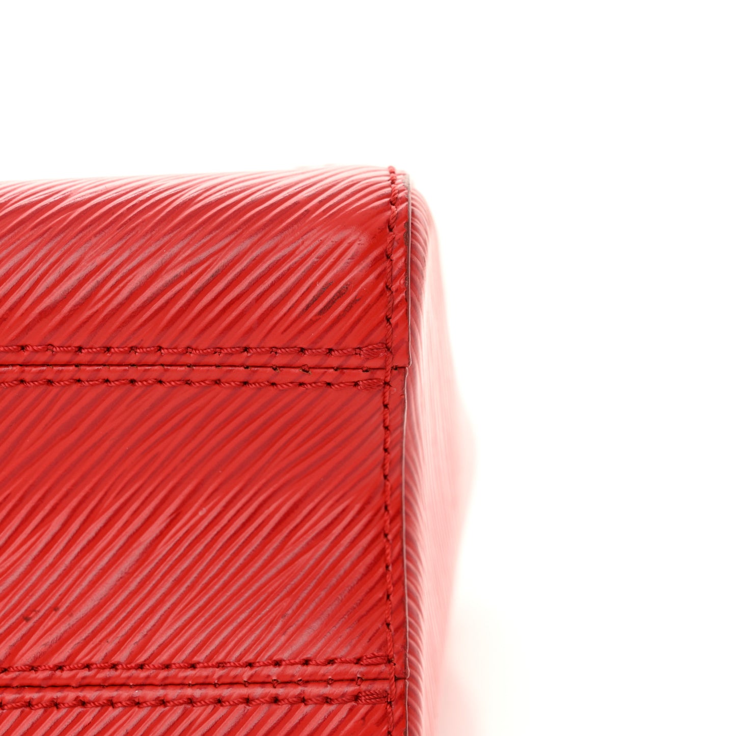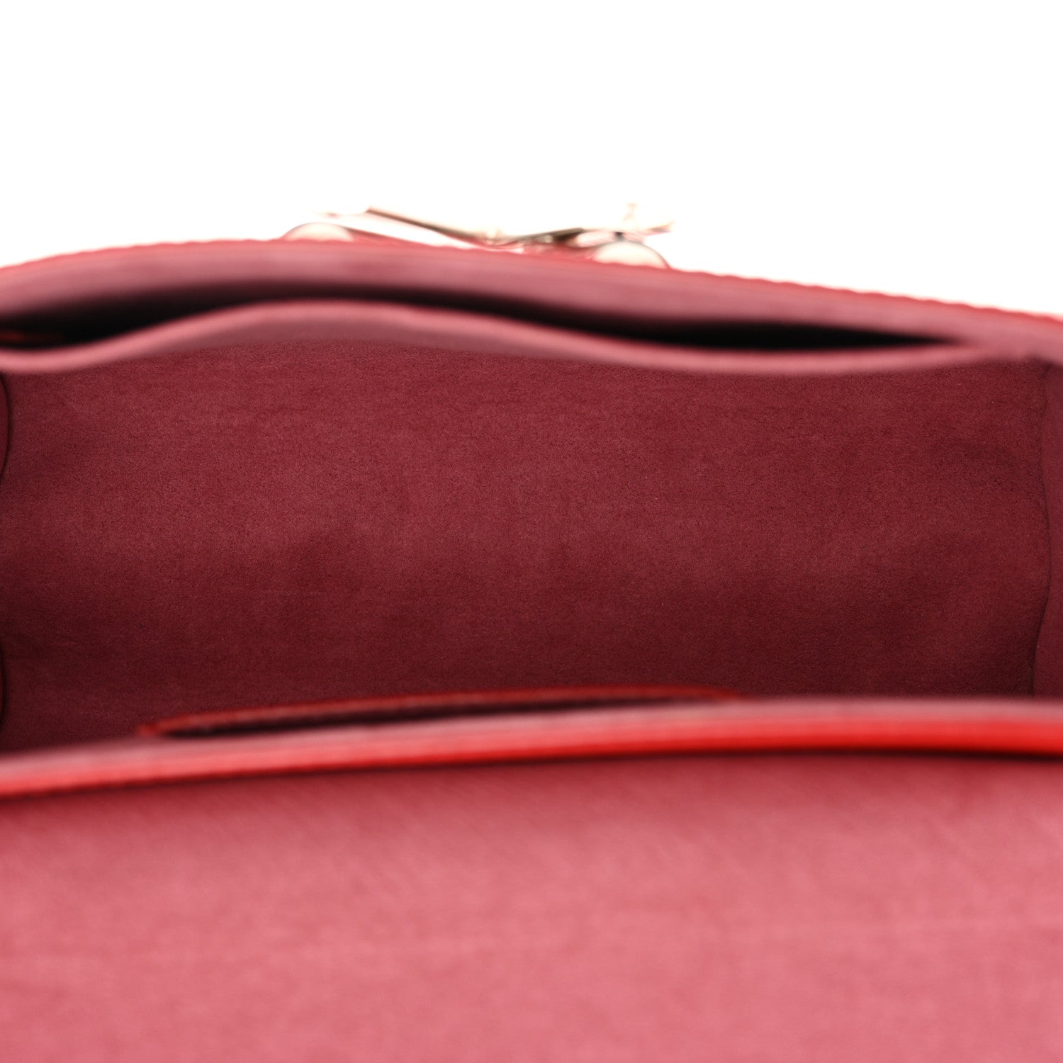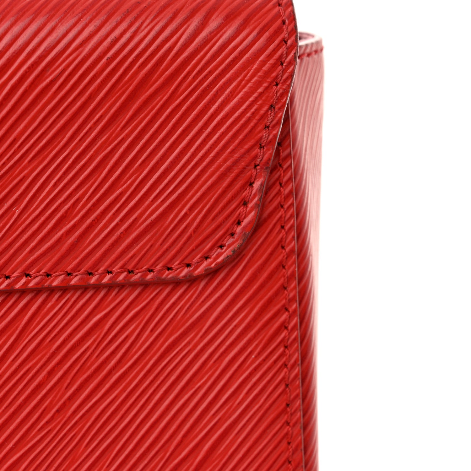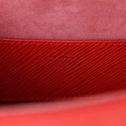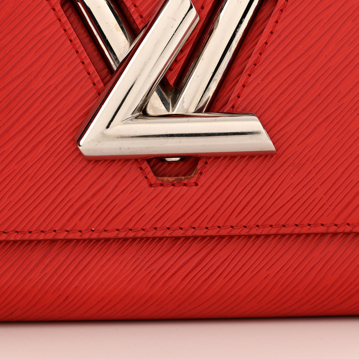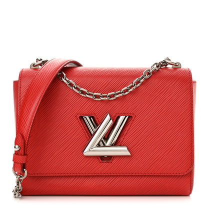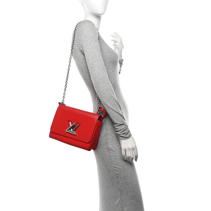 This is an authentic LOUIS VUITTON Epi Twist Shoulder Bag MM in Coquelicot. This stylish waist-length crossbody bag is crafted of textured epi leather in dark red. The bag features a silver chain shoulder strap with a leather shoulder pad and a matching LV turn-lock on the facing flap. This opens to a pink microfiber interior with patch pockets.Follow this item for alerts. Louis Vuitton is a registered trademark of Louis Vuitton. FASHIONPHILE is not affiliated with Louis Vuitton.