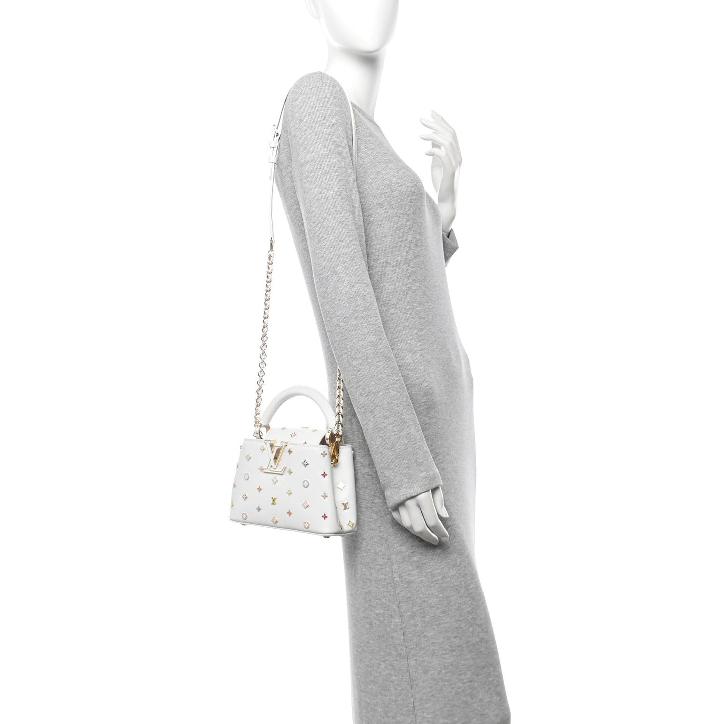 This is an authentic LOUIS VUITTON LV X TM Cowhide Mini Capucines in Multicolor. This beautiful bag is composed of white cowhide leather with multicolored monogram motif in metallic studs. The handbag features a single rolled leather top handle, a braided leather shoulder strap, and gold hardware. The crossover flap opens to a partitioned pink leather interior with a zipper pocket and a multicolored monogram motif patch pocket.Follow this item for alerts. Louis Vuitton is a registered trademark of Louis Vuitton. FASHIONPHILE is not affiliated with Louis Vuitton.