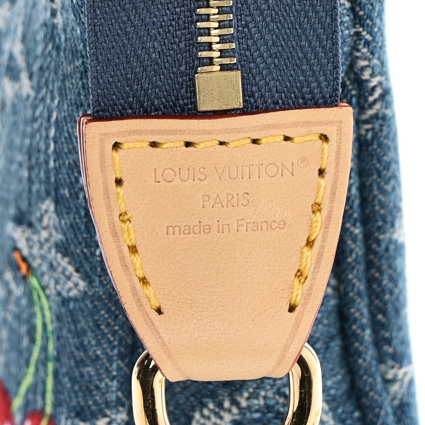 This is an authentic LOUIS VUITTON LV X TM Monogram Denim Cerises Pochette Accessories in Blue. In collaboration with Murakami, this chic pochette is crafted of denim with Murakami's' iconic cherries overlay. This pochette features vachetta cowhide leather trim lined with polished brass studs, a vachetta strap, and a chain strap. The top zipper opens to a matching interior with a patch pocket.Follow this item for alerts. Louis Vuitton is a registered trademark of Louis Vuitton. FASHIONPHILE is not affiliated with Louis Vuitton.