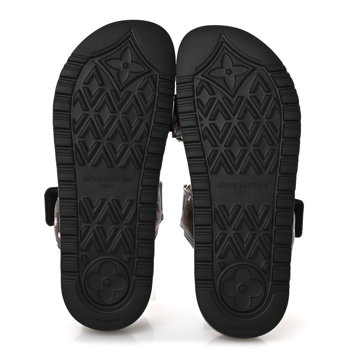 This is an authentic pair of LOUIS VUITTON LV X TM Monogram LV Sunset Flat Comfort Mule Sandals 38.5 in Sakura Brown. These chic mules are crafted of brown coated toile canvas. They feature a mid strap and an adjustable toe strap with a polished gold buckle on black rubber soles.Follow this item for alerts. Louis Vuitton is a registered trademark of Louis Vuitton. FASHIONPHILE is not affiliated with Louis Vuitton.