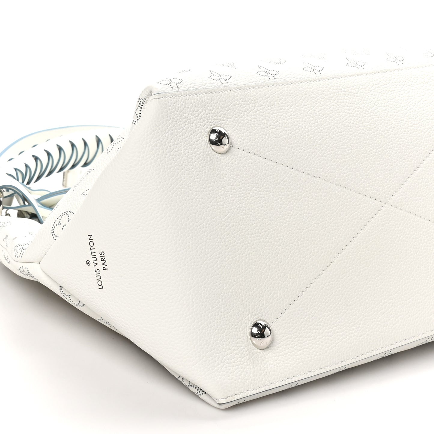 This is an authentic LOUIS VUITTON Mahina Beaubourg Hobo MM in Snow. This chic hobo bag is crafted of white calfskin leather perforated with the Louis Vuitton monogram. The shoulder bag features a woven leather top handle, a luggage tag, and an optional adjustable shoulder strap with silver hardware. The top zipper opens to a blue suede interior with a zipper and patch pockets.Follow this item for alerts. Louis Vuitton is a registered trademark of Louis Vuitton. FASHIONPHILE is not affiliated with Louis Vuitton.