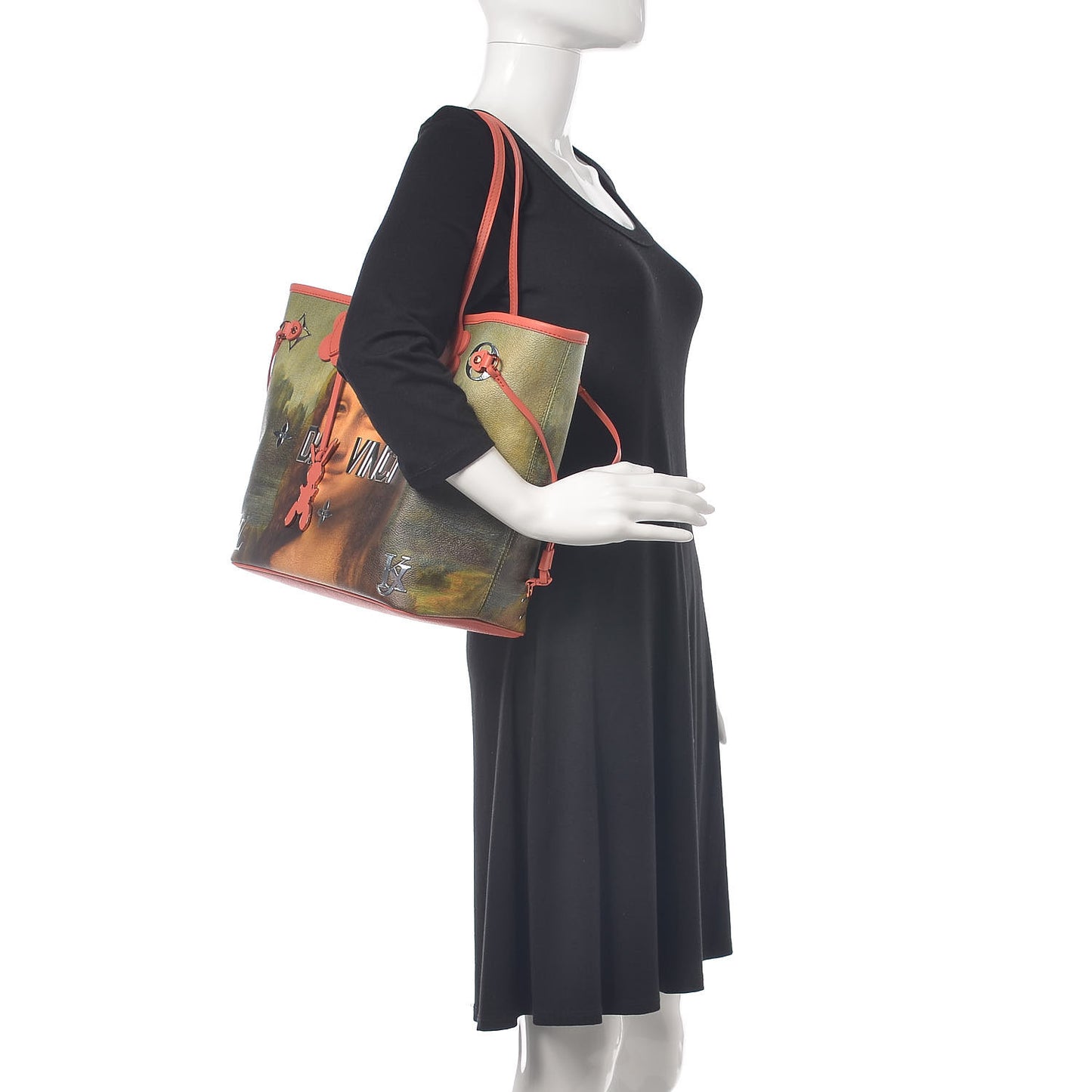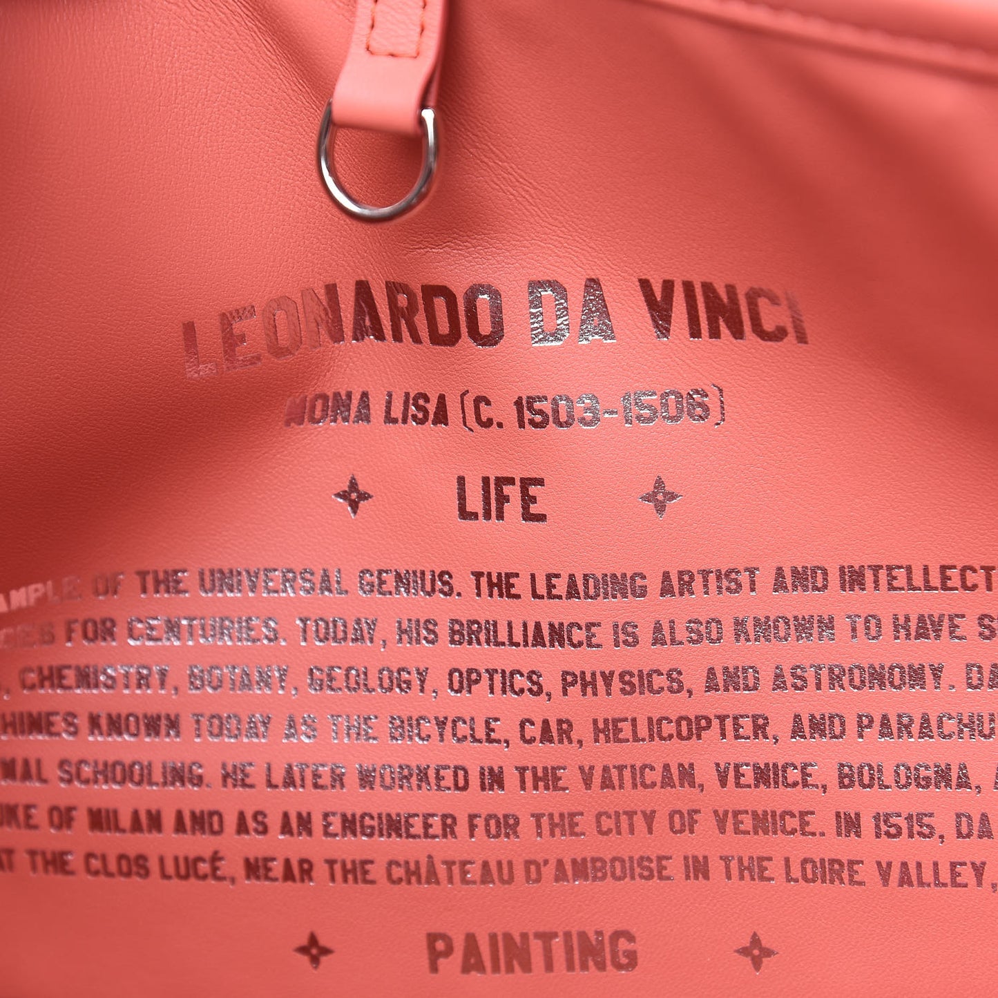 This is an authentic LOUIS VUITTON Masters Jeff Koons Da Vinci Neverfull MM. This chic tote is made of a rendition of a Da Vinci painting of Mona Lisa on a coated canvas. The shoulder bag features pink calfskin leather trim, leather shoulder straps, silver Monogram serti flower shapes and bold silver reflective metallic letters that spell Da Vinci. The wide top is open to a pink leather interior with a hanging zipper pocket, printed and filled with silver that tells you more about this exciting collaboration and a matching removable pochette. This is an excellent tote for everyday wear, by Louis Vuitton!Follow this item for alerts. Louis Vuitton is a registered trademark of Louis Vuitton. FASHIONPHILE is not affiliated with Louis Vuitton.