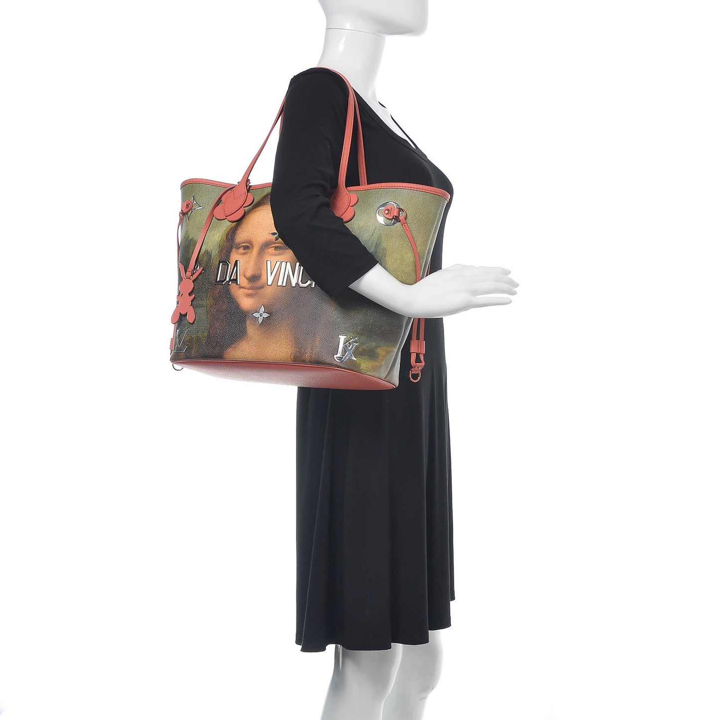 This is an authentic LOUIS VUITTON Masters Jeff Koons Da Vinci Neverfull MM. This chic tote is made of a rendition of a Da Vinci painting of Mona Lisa on a coated canvas. The shoulder bag features pink calfskin leather trim, leather shoulder straps, silver Monogram serti flower shapes and bold silver reflective metallic letters that spell Da Vinci. The wide top is open to a pink leather interior with a hanging zipper pocket, printed and filled with silver that tells you more about this exciting collaboration and a matching removable pochette. This is an excellent tote for everyday wear, by Louis Vuitton!Follow this item for alerts. Louis Vuitton is a registered trademark of Louis Vuitton. FASHIONPHILE is not affiliated with Louis Vuitton.