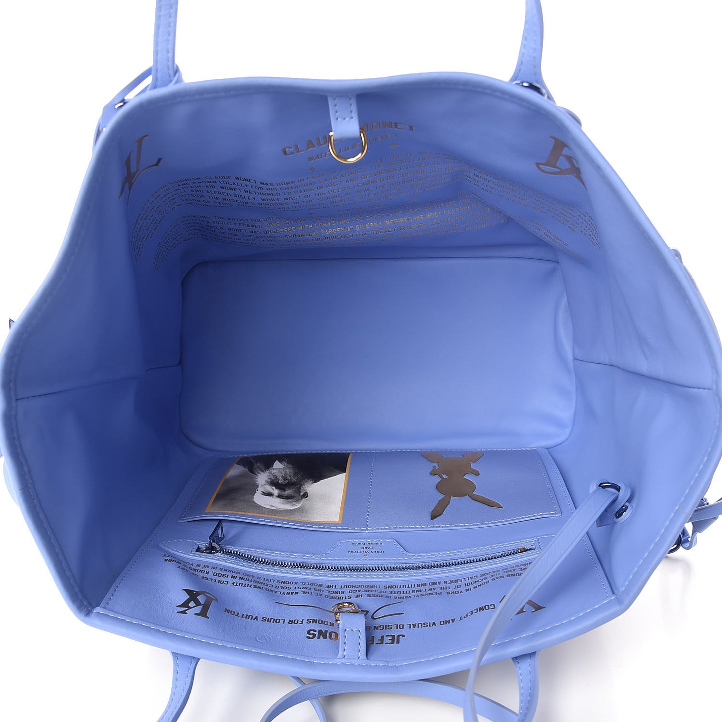 This is an authentic LOUIS VUITTON Masters Jeff Koons Monet Neverfull MM. This chic tote is made of a rendition of a Monet painting of a pond on coated canvas. The shoulder bag features light blue calfskin leather trim, leather shoulder straps, gold Monogram serti flower shapes and bold gold reflective metallic letters that spell Monet. The wide top is open to a light blue leather interior with a hanging zipper pocket, a pochette, and printed and filled with gold description about this exciting collaboration. This is an excellent tote for everyday wear, by Louis Vuitton!Follow this item for alerts. Louis Vuitton is a registered trademark of Louis Vuitton. FASHIONPHILE is not affiliated with Louis Vuitton.