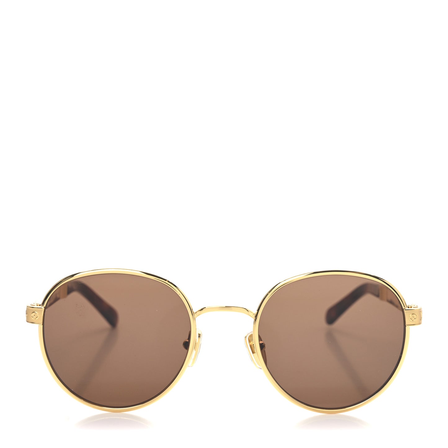 This is an authentic LOUIS VUITTON Metal Z2916U LV Aura Round Sunglasses in Brown. These classically styled round sunglasses feature gold metal frames, gradient brown lenses and a gold-toned acetate and metal frame with monogram engraving.Follow this item for alerts. Louis Vuitton is a registered trademark of Louis Vuitton. FASHIONPHILE is not affiliated with Louis Vuitton.