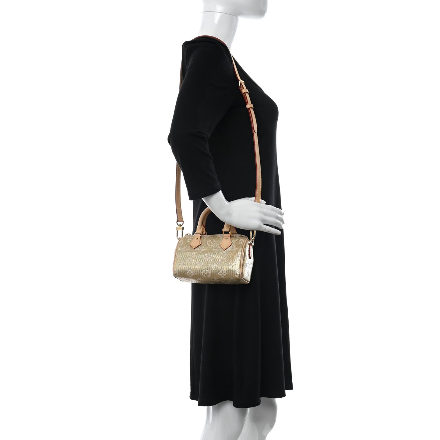 This is an authentic LOUIS VUITTON Monoglam Nano Speedy in Beige. This mini speedy is crafted of monoglam coated canvas in a shimmering beige. It features rolled leather top handles, an optional shoulder strap, and polished gold-tone hardware. The top zipper opens to a fabric interior.Follow this item for alerts. Louis Vuitton is a registered trademark of Louis Vuitton. FASHIONPHILE is not affiliated with Louis Vuitton.
