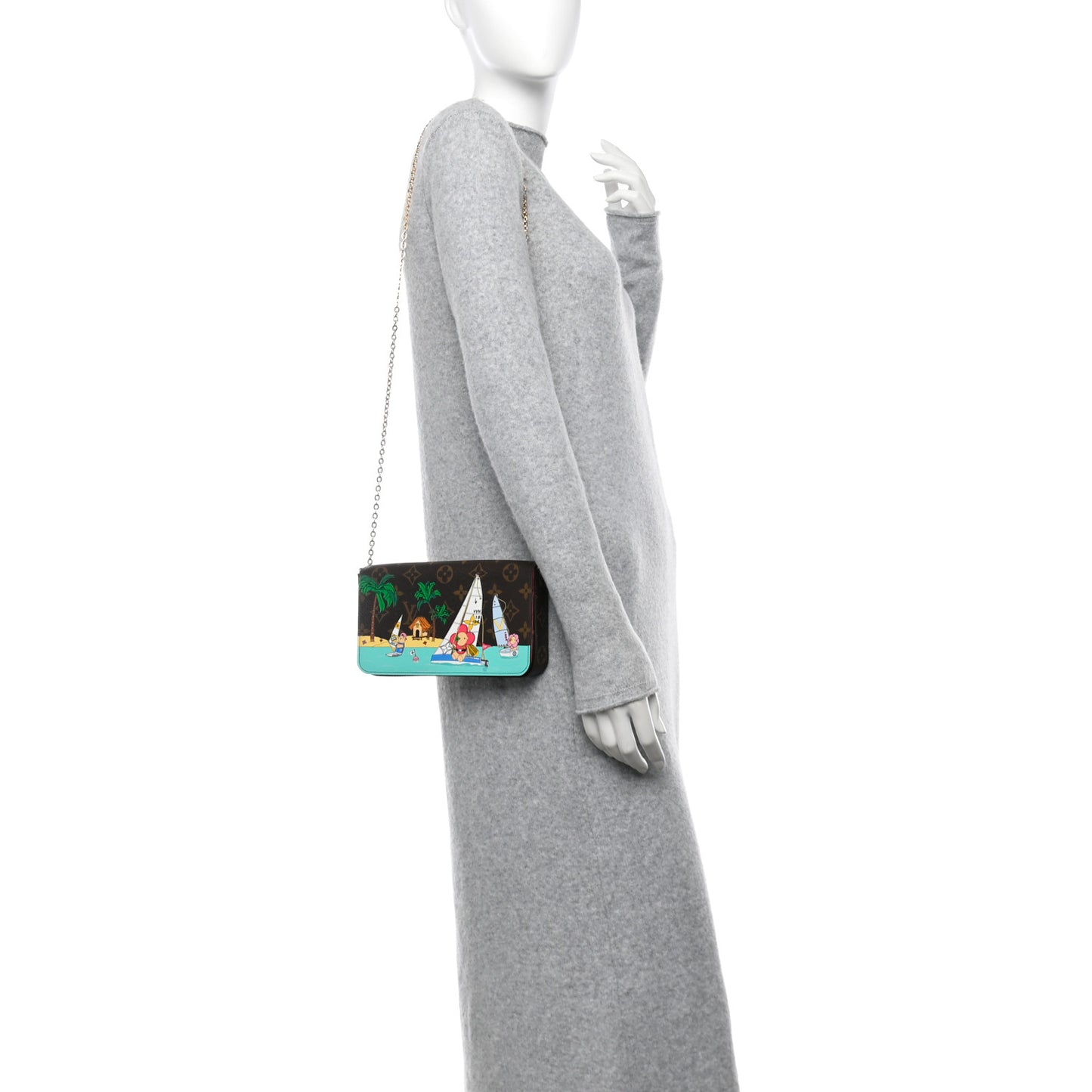 This is an authentic LOUIS VUITTON Monogram 2023 Christmas Animation Sailing Pochette Felicie Chain Wallet in Dragonfruit Pink. This stylish wallet is crafted of classic Louis Vuitton coated canvas in brown. The wallet features an optional polished brass chain-link shoulder strap and an envelope-style crossover flap with a matching brass snap. This opens to a pink fabric interior with a pocket.Follow this item for alerts. Louis Vuitton is a registered trademark of Louis Vuitton. FASHIONPHILE is not affiliated with Louis Vuitton.