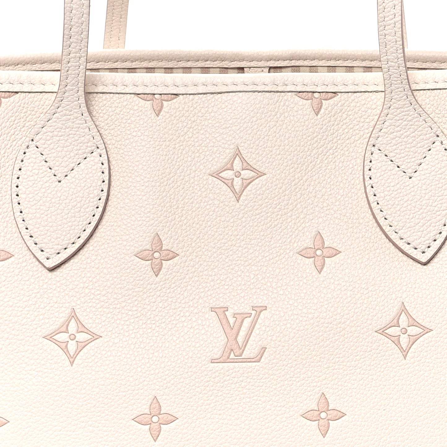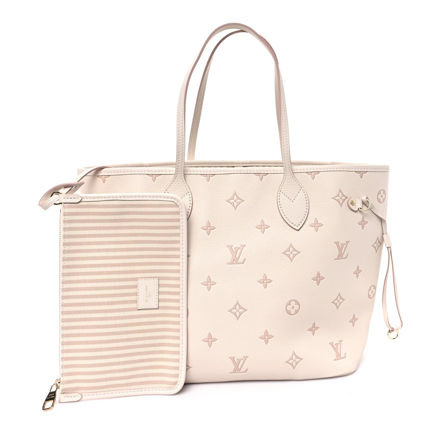 This is an authentic LOUIS VUITTON Monogram Debossed Neverfull MM in Eden. This beautiful tote is crafted of beige with pink undertones monogram debossed leather. It features leather top handles and polished gold-tone hardware. The top opens to a striped fabric interior with a hanging zipper pocket and a removable pochette.Follow this item for alerts. Louis Vuitton is a registered trademark of Louis Vuitton. FASHIONPHILE is not affiliated with Louis Vuitton.