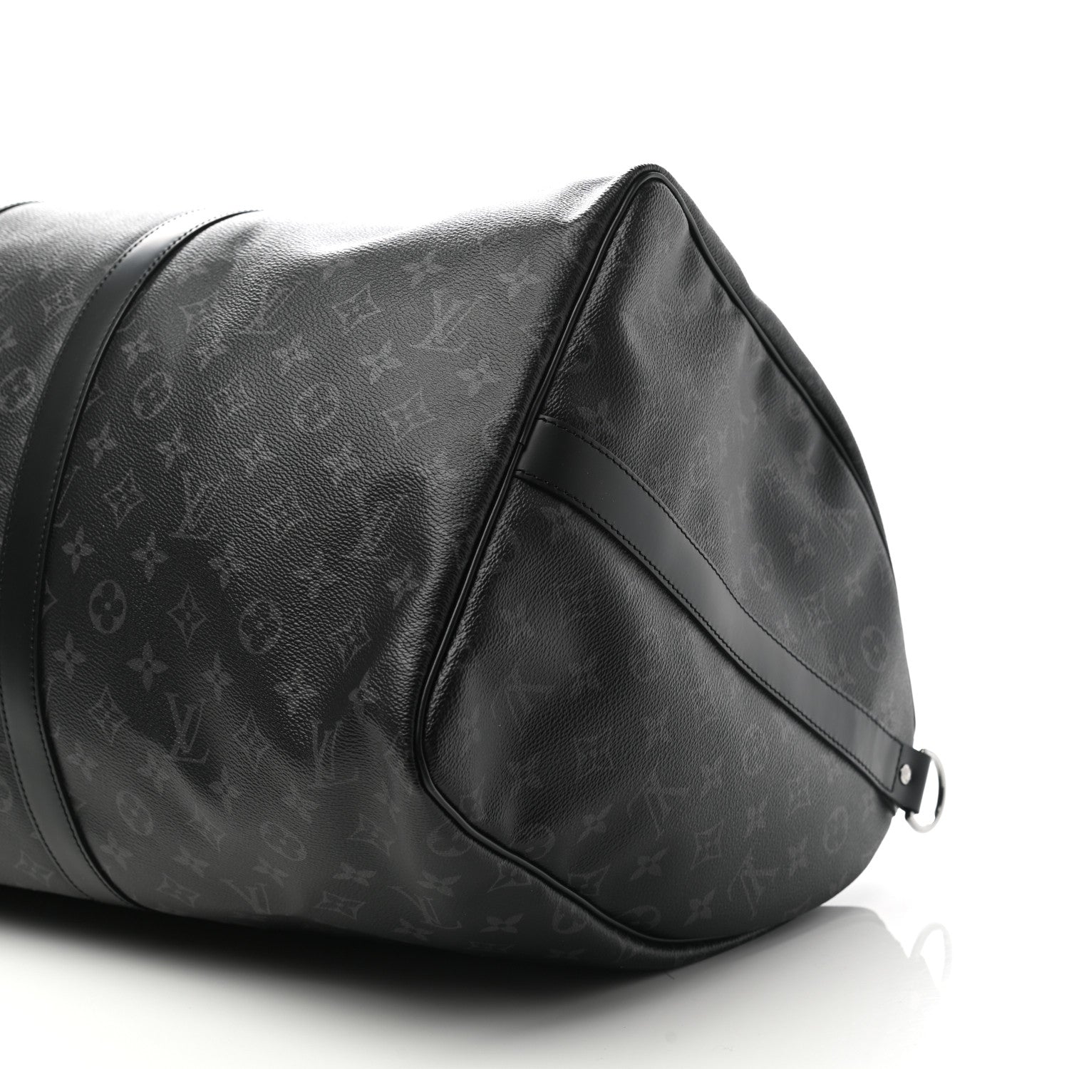 This is an authentic LOUIS VUITTON Monogram Eclipse Keepall Bandouliere 55. This stylish duffel is crafted of signature Louis Vuitton monogram toile canvas in black and grey. This travel bag features black cowhide leather rolled top handles and black leather trim. The polished dark silver top zippers open to a spacious black fabric interior with a hanging zippered pocket.Follow this item for alerts. Louis Vuitton is a registered trademark of Louis Vuitton. FASHIONPHILE is not affiliated with Louis Vuitton.