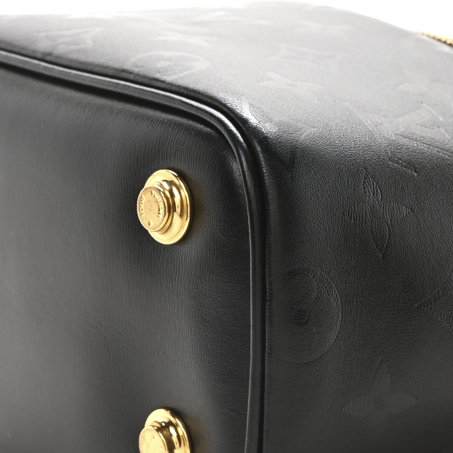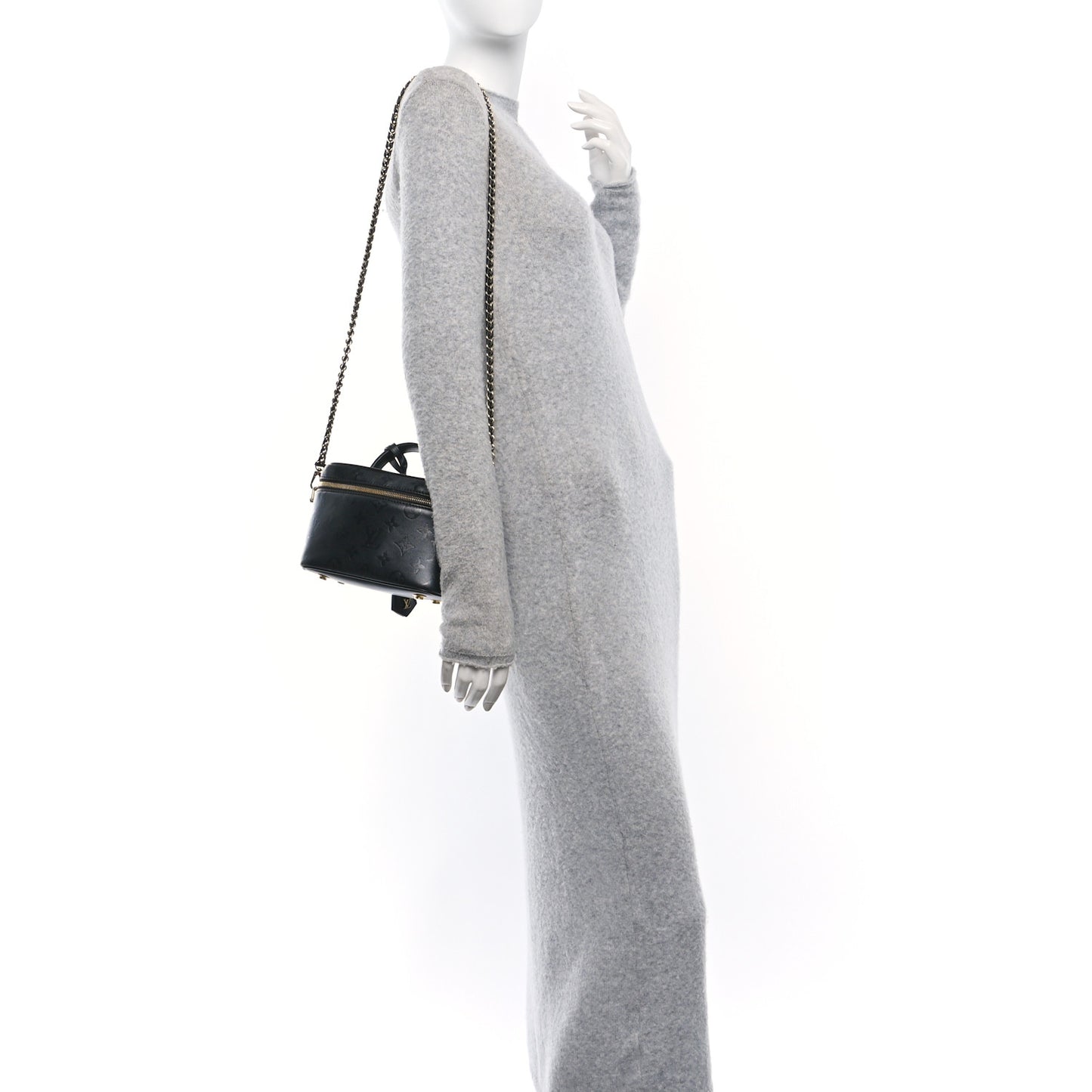 This is an authentic LOUIS VUITTON Monogram Ink Vanity PM in Black. This chic handbag is crafted of embossed lambskin leather. The case features a black leather top handle, an optional leather braided gold chain shoulder strap, and gold hardware. The top zipper opens to a black microfiber interior with a small patch pocket.Follow this item for alerts. Louis Vuitton is a registered trademark of Louis Vuitton. FASHIONPHILE is not affiliated with Louis Vuitton.
