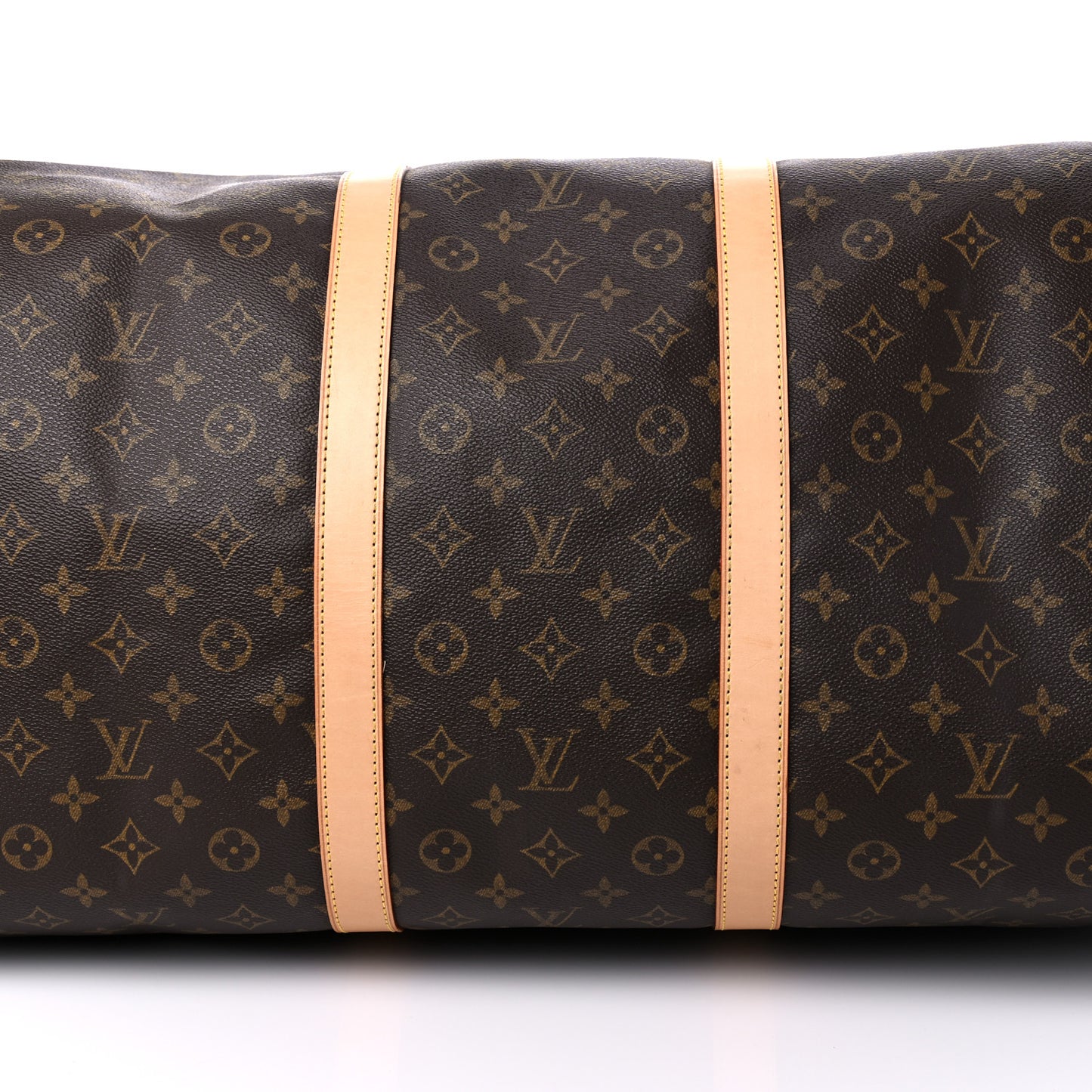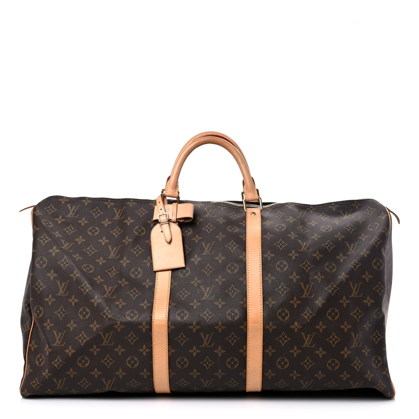 This is an authentic LOUIS VUITTON Monogram Keepall 60. This stylish bag is crafted of signature Louis Vuitton monogram toile canvas. The bag features vachetta cowhide leather trim and rolled leather top handles with brass hardware. The top zipper opens the bag to a spacious cocoa brown fabric interior.Follow this item for alerts. Louis Vuitton is a registered trademark of Louis Vuitton. FASHIONPHILE is not affiliated with Louis Vuitton.