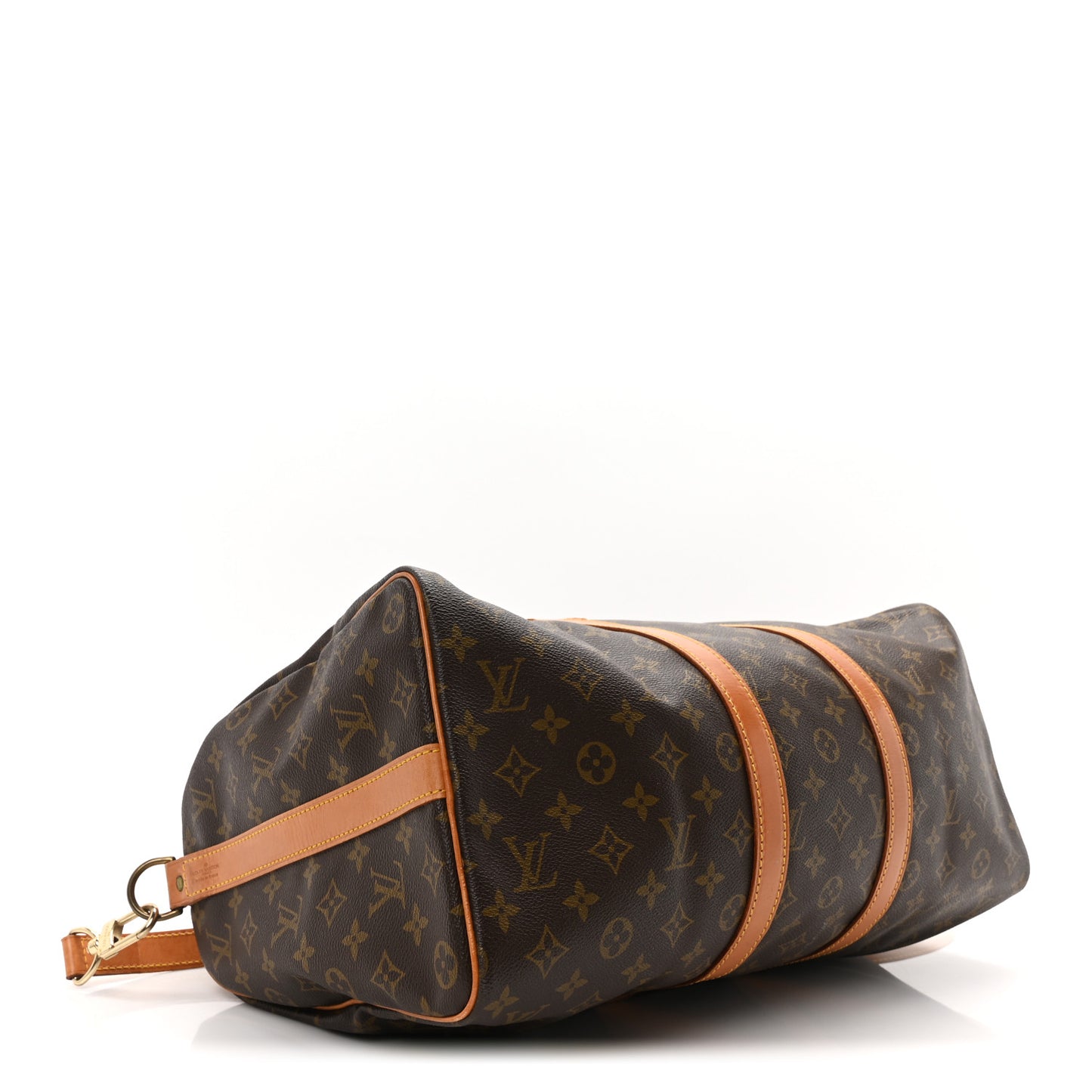 This is an authentic LOUIS VUITTON Monogram Keepall Bandouliere 45. This stylish duffel is crafted of monogram coated canvas. The tote features vachetta rolled top handles, an optional vachetta shoulder strap, trim, and gold hardware. The top zipper opens to a brown fabric interior.Follow this item for alerts. Louis Vuitton is a registered trademark of Louis Vuitton. FASHIONPHILE is not affiliated with Louis Vuitton.
