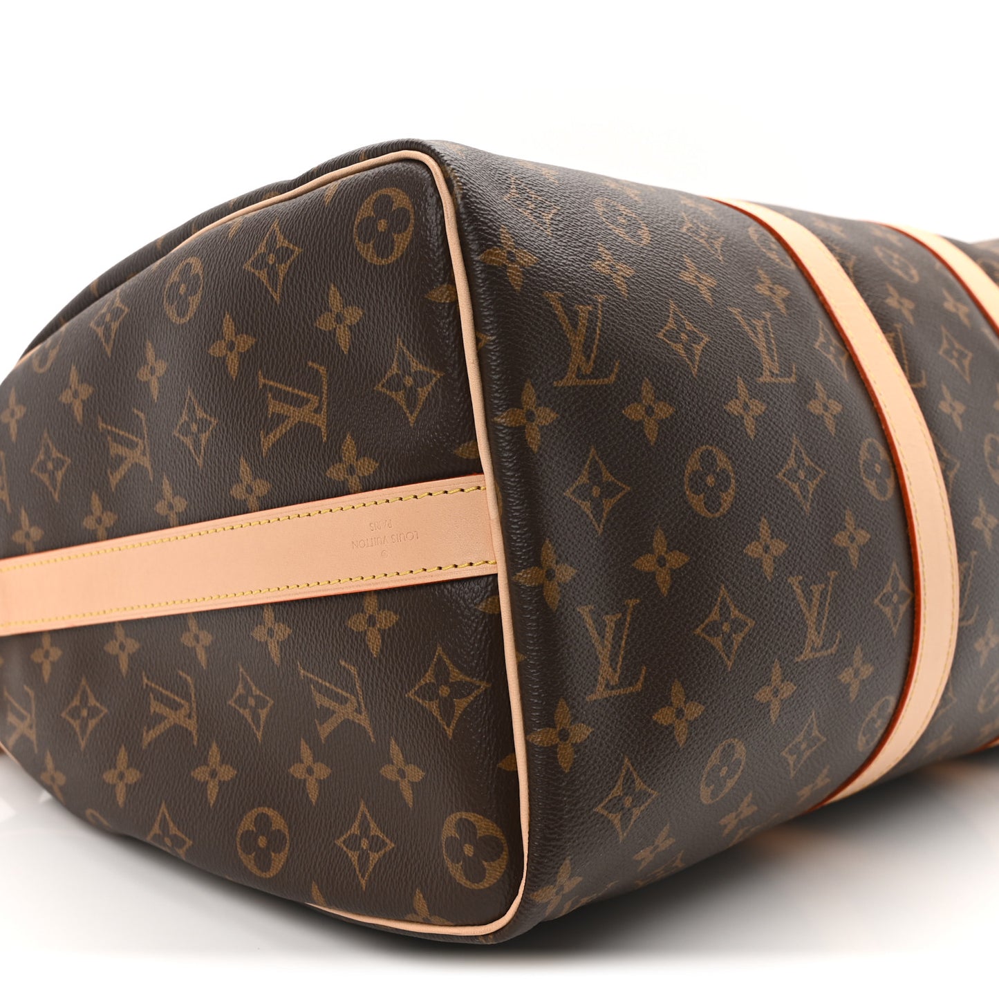 This is an authentic LOUIS VUITTON Monogram Keepall Bandouliere 45. This bag is crafted of signature Louis Vuitton monogram-coated canvas. It features natural rolled vachetta leather top handles, trim, and a removable, adjustable shoulder strap with brass hardware. The top zippers open to a spacious cocoa-brown fabric interior with a hanging zipper pocket.Follow this item for alerts. Louis Vuitton is a registered trademark of Louis Vuitton. FASHIONPHILE is not affiliated with Louis Vuitton.