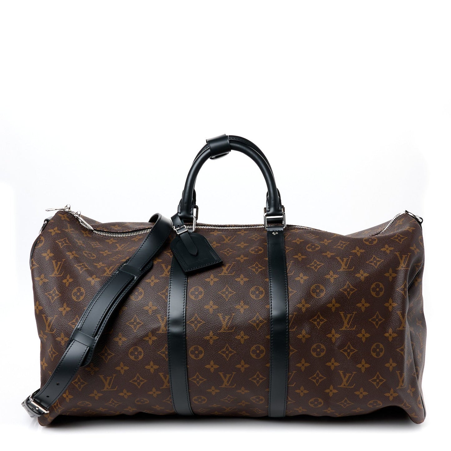 This is an authentic LOUIS VUITTON Monogram Macassar Keepall Bandouliere 55. This duffle is crafted of Louis Vuitton monogram coated canvas in brown with the Macassar black leather trim, top handles, and removable adjustable shoulder strap. The top zipper opens to a burgundy fabric interior with a hanging zippered pocket.Follow this item for alerts. Louis Vuitton is a registered trademark of Louis Vuitton. FASHIONPHILE is not affiliated with Louis Vuitton.