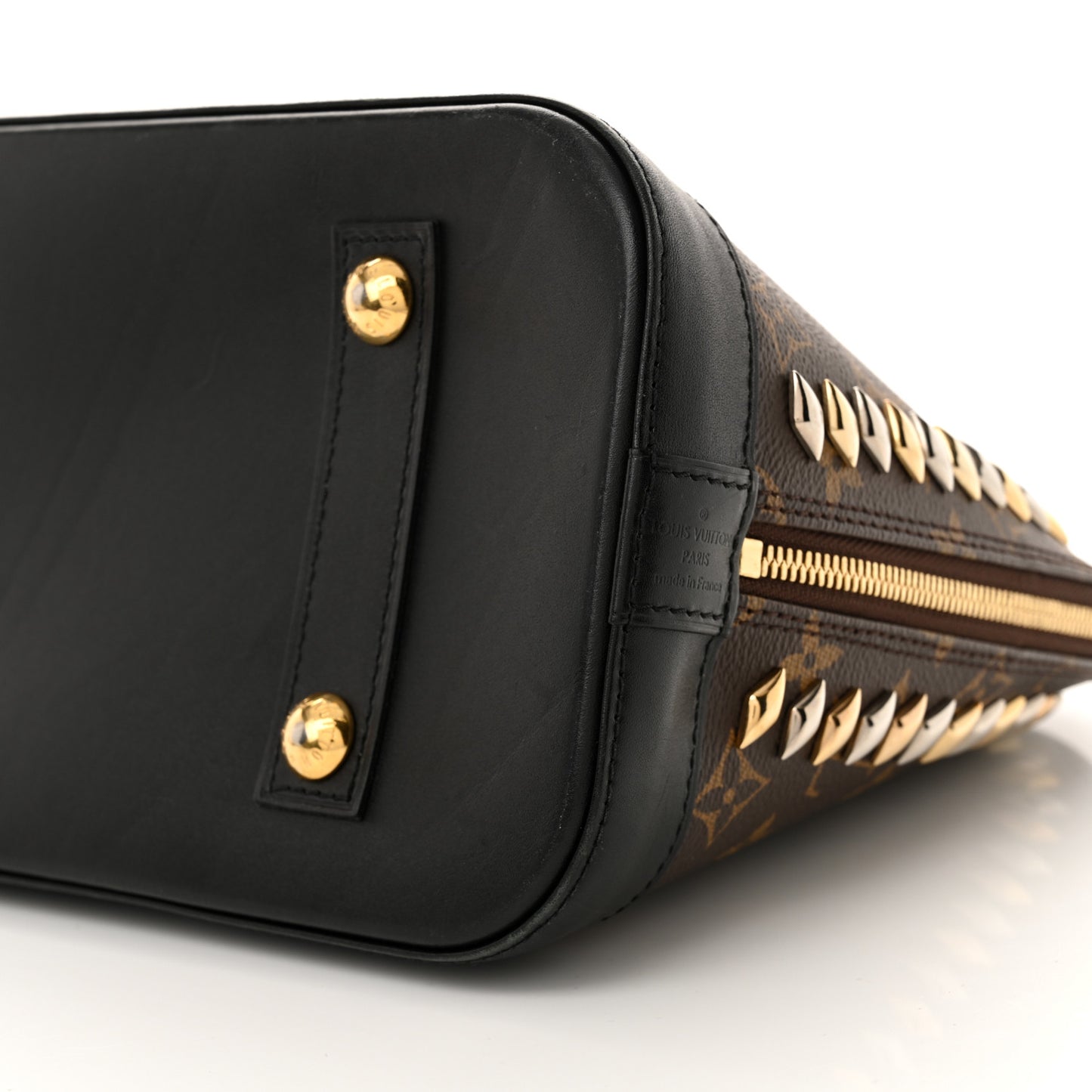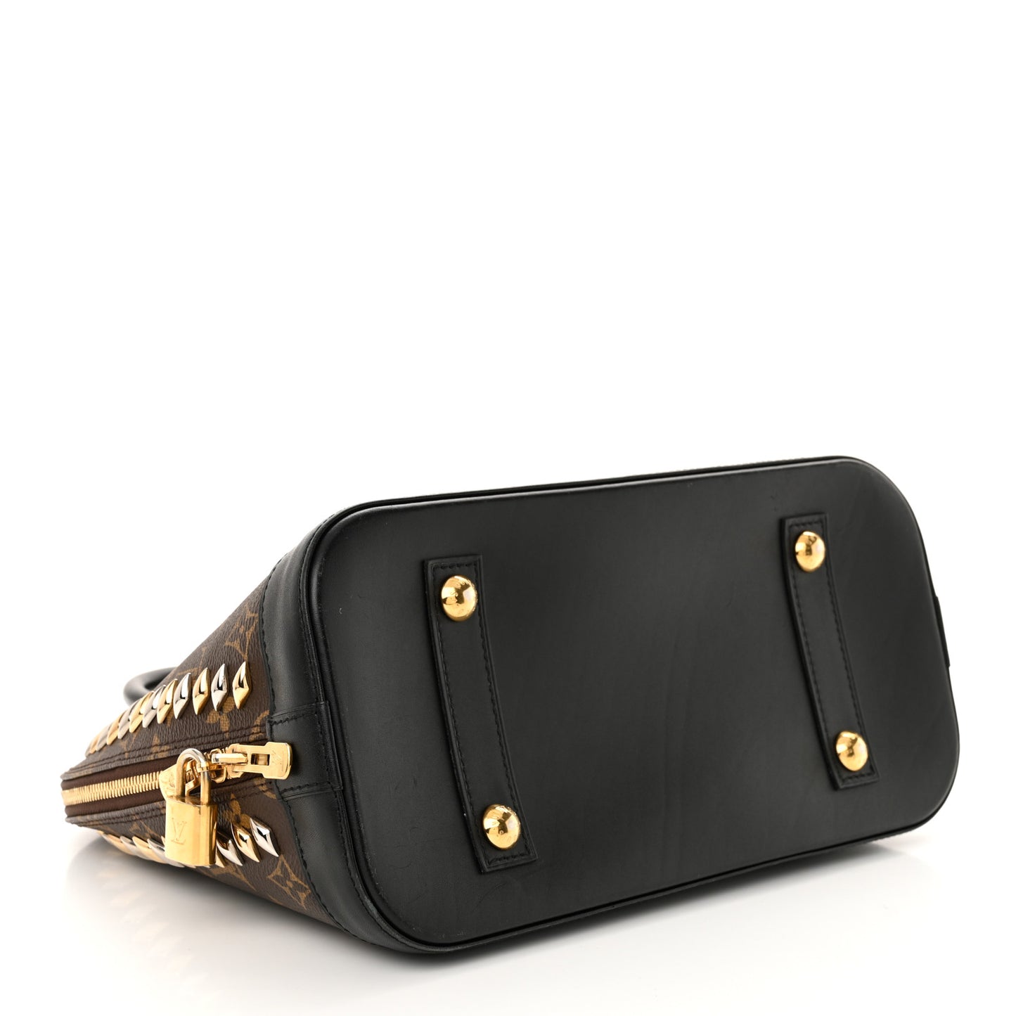 This is an authentic LOUIS VUITTON Monogram Metal Stones Alma PM. This chic bowler style bag is crafted of traditional monogram on toile canvas. It features rolled black leather top handles with brass links, a full leather base, wrap-around zippers, and gold and silver studs along the edges. The handbag opens to a brown fabric interior with patch pockets.Follow this item for alerts. Louis Vuitton is a registered trademark of Louis Vuitton. FASHIONPHILE is not affiliated with Louis Vuitton.