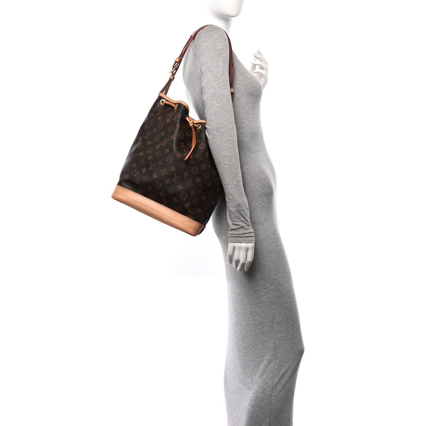 This is an authentic LOUIS VUITTON Monogram Noe. This classic bucket style shoulder bag is crafted of Louis Vuitton monogram on coated canvas. The shoulder bag features vachetta cowhide leather including a solid base, an adjustable shoulder strap, and top cinch strap with polished brass hardware. This bag opens to a brown fabric interior.Follow this item for alerts. Louis Vuitton is a registered trademark of Louis Vuitton. FASHIONPHILE is not affiliated with Louis Vuitton.