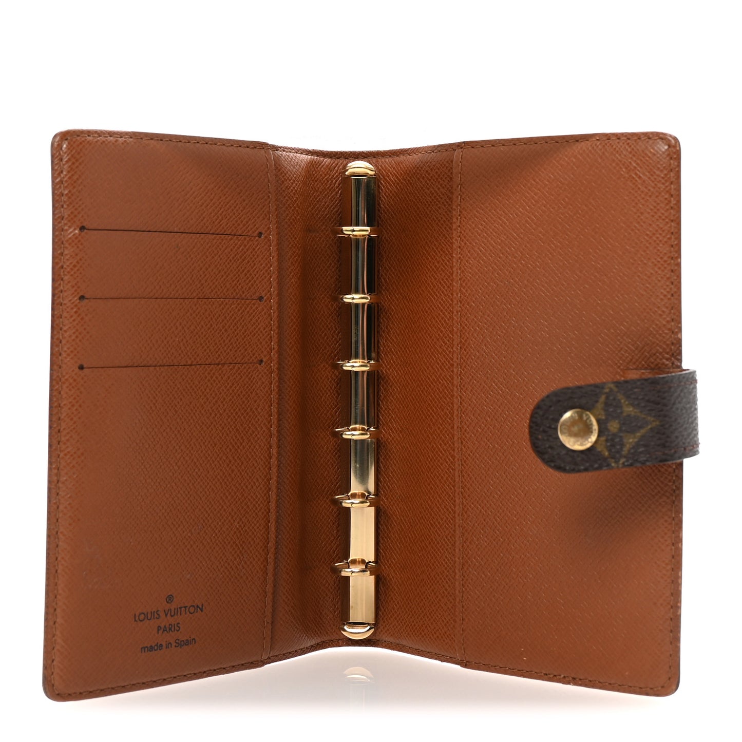 This is an authentic LOUIS VUITTON Monogram Small Ring Agenda. This stylish agenda features an exterior of Louis Vuitton monogram on toile canvas that is held by a crossover polished gold snap closure. It opens to an interior of terra-cotta cross-grained leather with card slots and patch pockets. The agenda has a small brass six-ring binder that holds Louis Vuitton inserts.Follow this item for alerts. Louis Vuitton is a registered trademark of Louis Vuitton. FASHIONPHILE is not affiliated with Louis Vuitton.