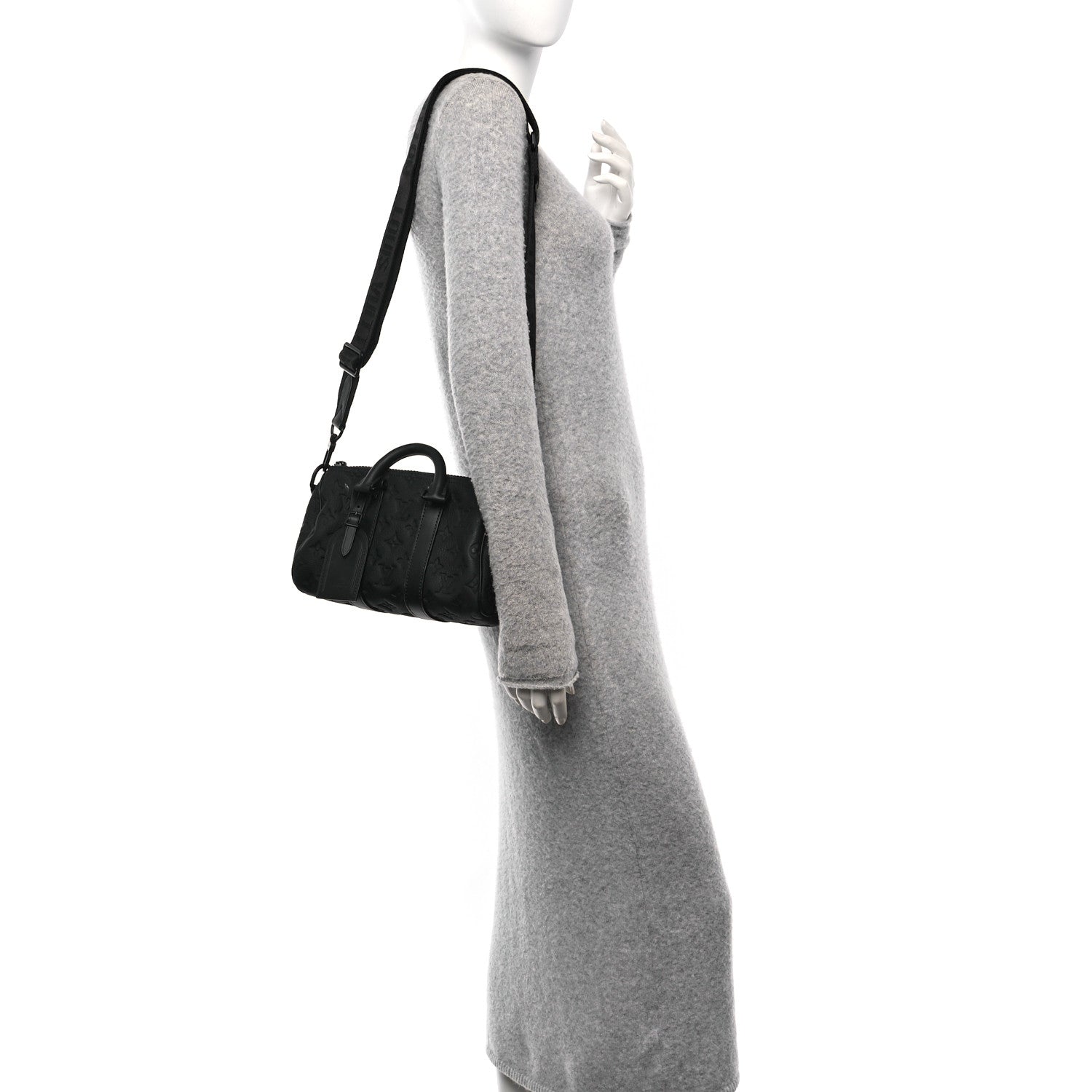 This is an authentic LOUIS VUITTON Monogram Taurillon Keepall Bandouliere 25 in Black. This chic shoulder bag features Louis Vuitton monogram leather in black with LV embossed logos. The shoulder bag features a black leather shoulder strap with matte black chain links and matching hardware. The top zipper opens to a black fabric interior with a patch pocket.Follow this item for alerts. Louis Vuitton is a registered trademark of Louis Vuitton. FASHIONPHILE is not affiliated with Louis Vuitton.