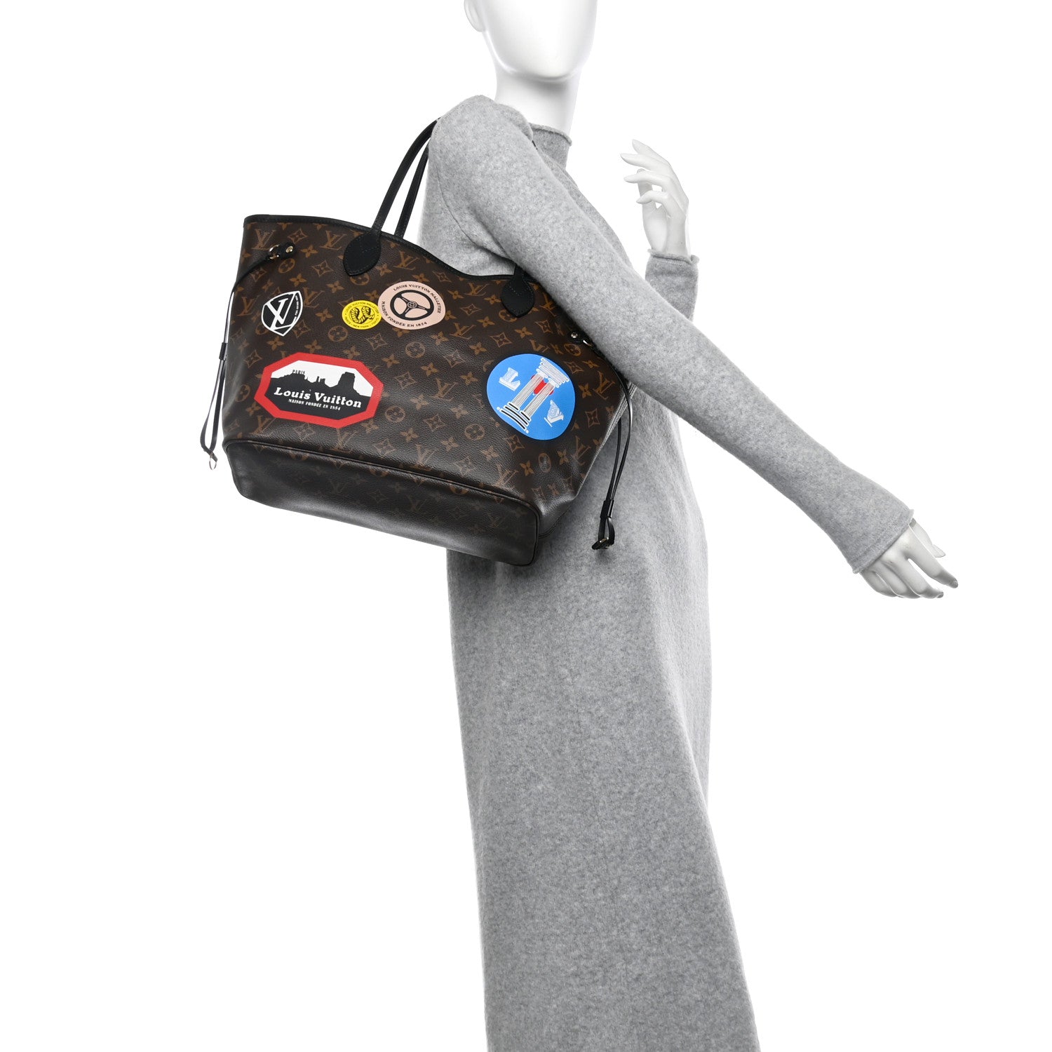This is an authentic LOUIS VUITTON Monogram World Tour Neverfull MM. This chic tote is finely crafted of Louis Vuitton monogram on brown toile canvas. The tote features a playful look of classic stickers, black leather trim, and black leather shoulder straps. The wide top is open to a red striped fabric interior with a hanging zipper pocket.Follow this item for alerts. Louis Vuitton is a registered trademark of Louis Vuitton. FASHIONPHILE is not affiliated with Louis Vuitton.
