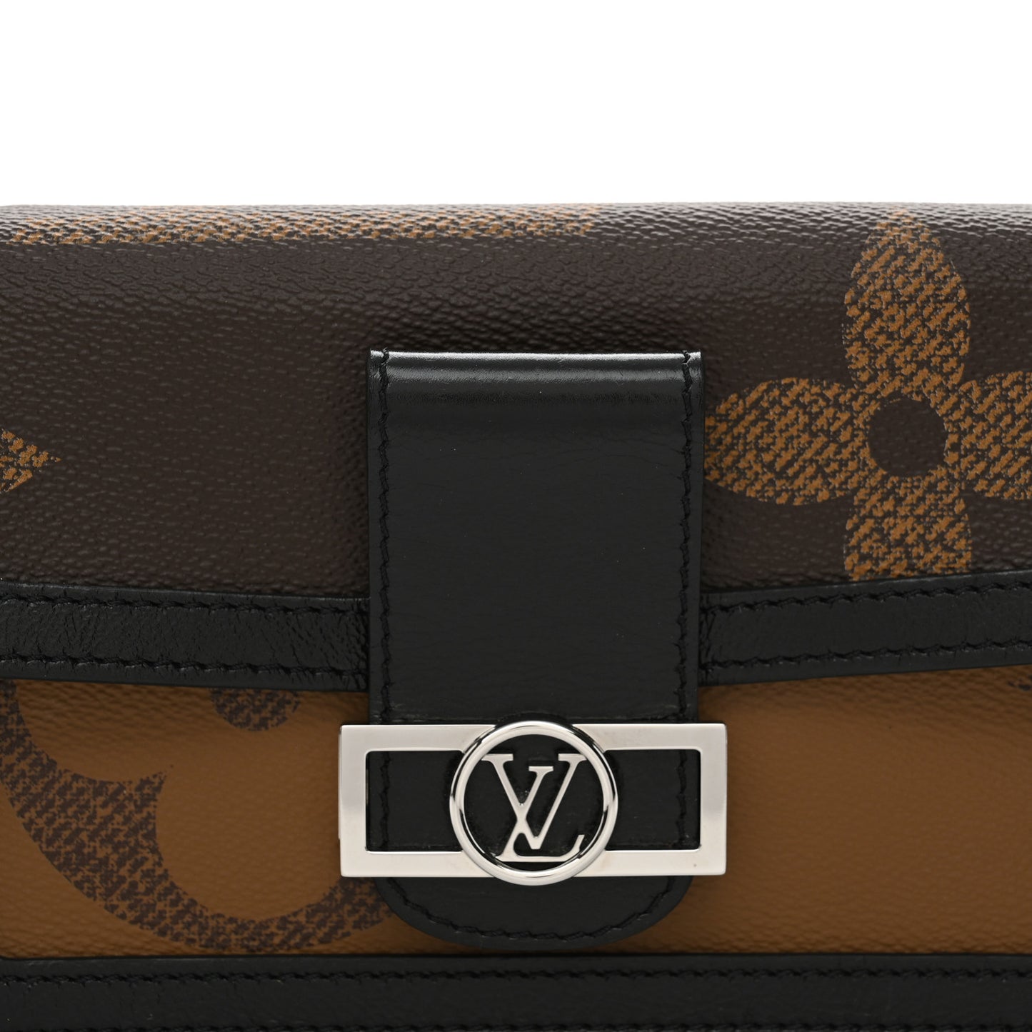 This is an authentic LOUIS VUITTON Reverse Monogram Giant Dauphine Bumbag. This stylish shoulder bag is crafted of oversided Louis Vuitton monogram on toile canvas. The handbag features a black leather shoulder strap, a facing flap with black leather trim, a removable belt strap and a decorative silver LV logo clasp. This opens to a partitioned black microfiber interior with zipper and patch pockets.Follow this item for alerts. Louis Vuitton is a registered trademark of Louis Vuitton. FASHIONPHILE is not affiliated with Louis Vuitton.