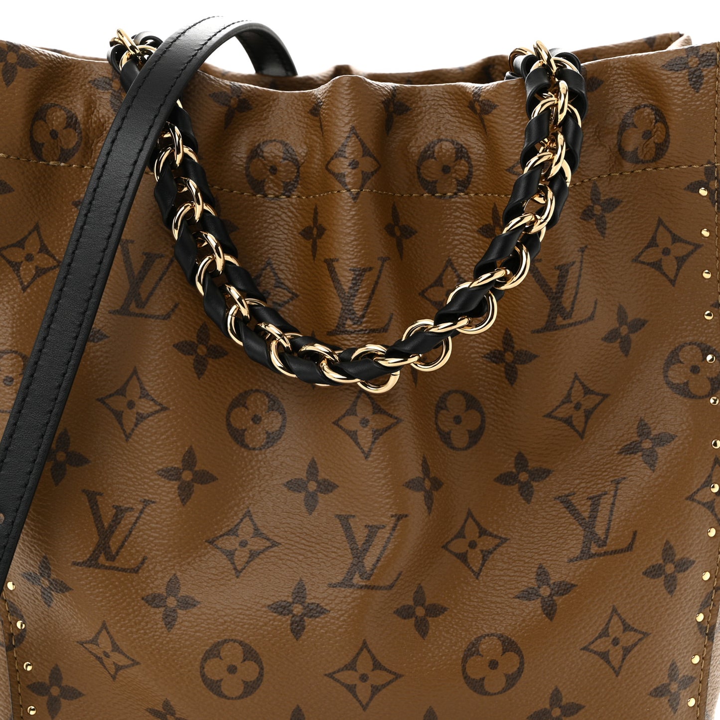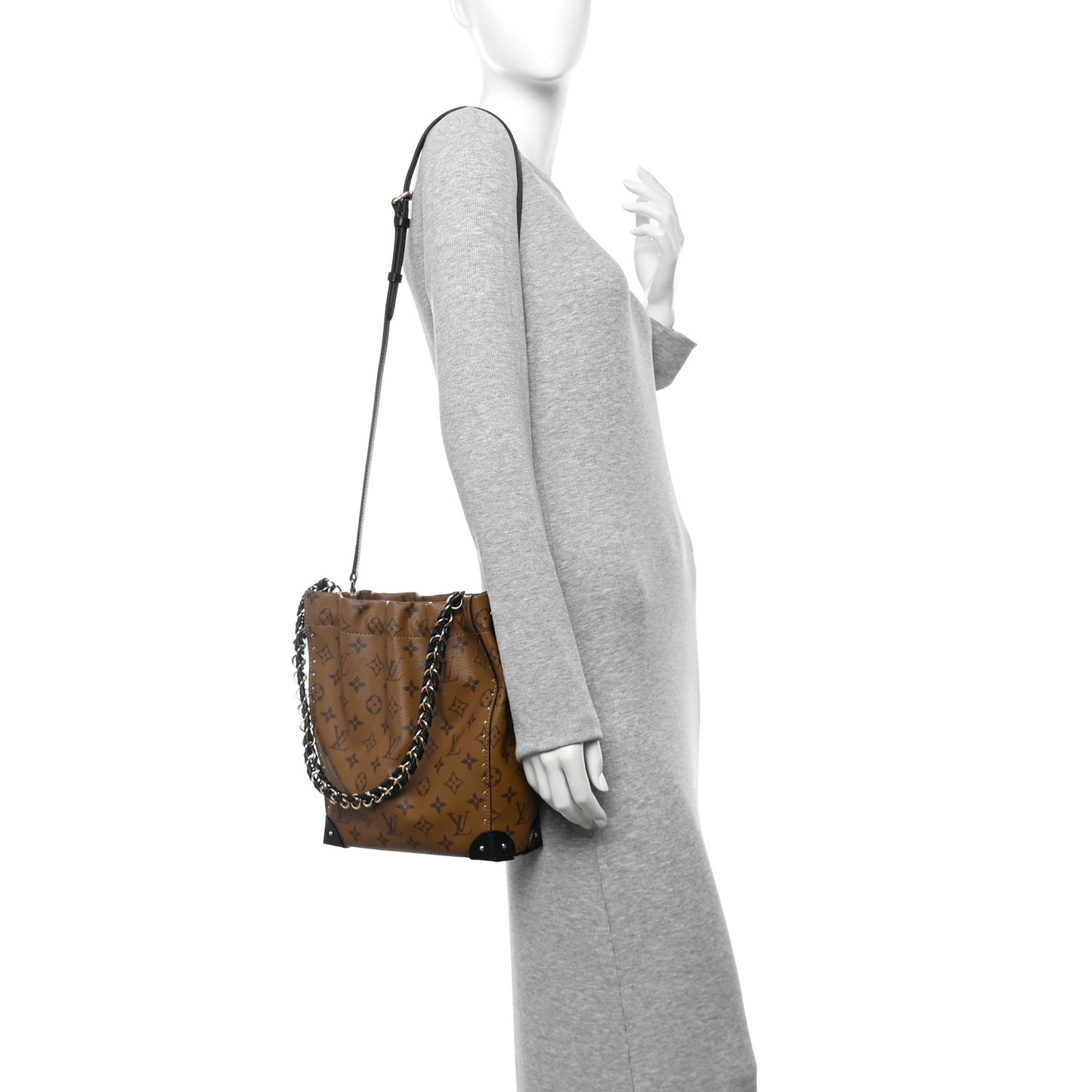 This is an authentic LOUIS VUITTON Reverse Monogram Noe Trunk PM. This stylish noe is crafted of Louis Vuitton Reverse Monogram in coated canvas with black smooth calfskin leather trim. This bag features a gold chain leather shoulder strap, an optional black leather shoulder strap, a solid base that can also be used as storage, a top cinch strap and polished brass hardware. This opens to a spacious black microfiber interior.Follow this item for alerts. Louis Vuitton is a registered trademark of Louis Vuitton. FASHIONPHILE is not affiliated with Louis Vuitton.