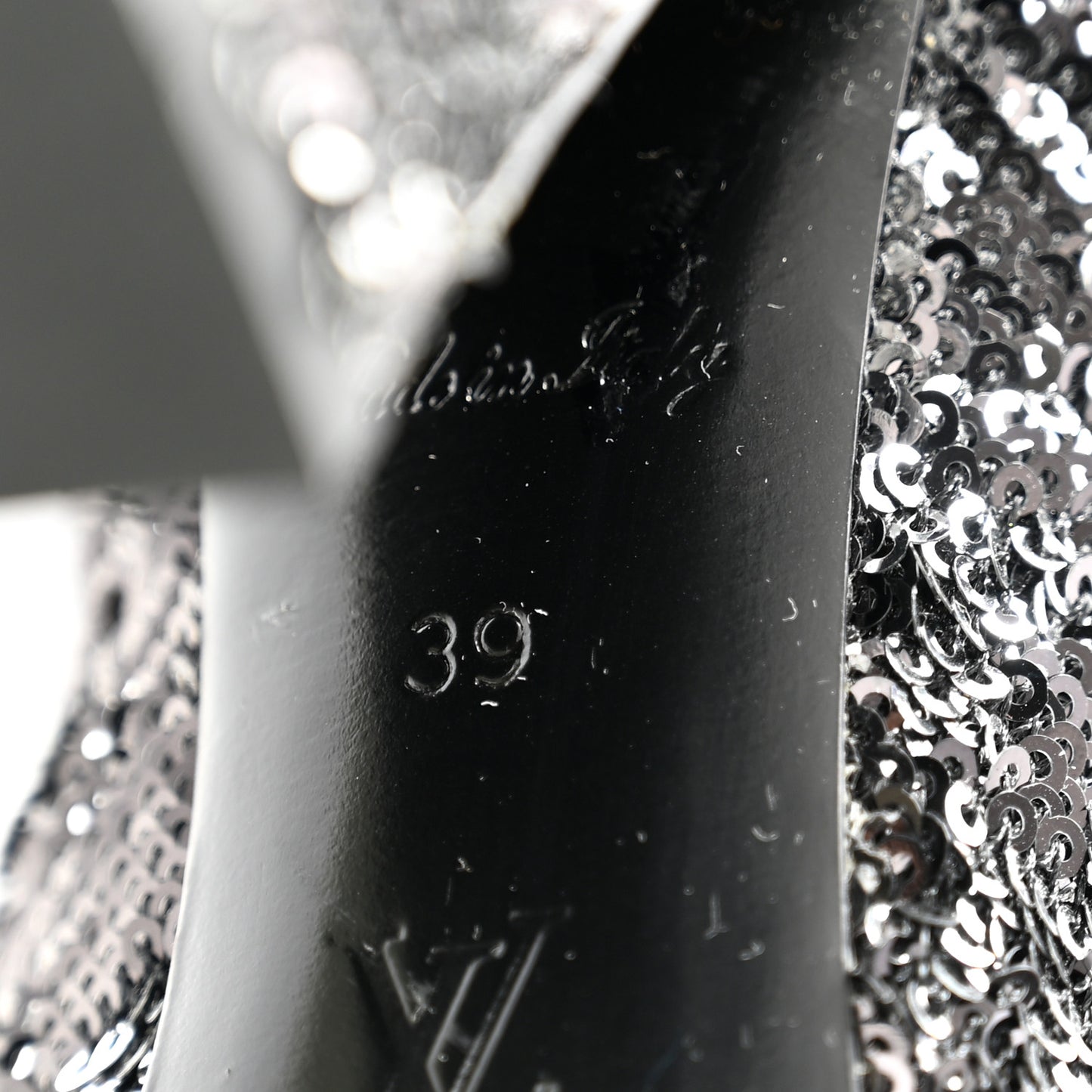 This is an authentic pair of LOUIS VUITTON Sequin Donna High Boots 39 Black. These stunning boots are crafted of sequins in black and silver. These tall boots feature a trim of coated canvas LV monogram and a 3.5 inch heel.Follow this item for alerts. Louis Vuitton is a registered trademark of Louis Vuitton. FASHIONPHILE is not affiliated with Louis Vuitton.
