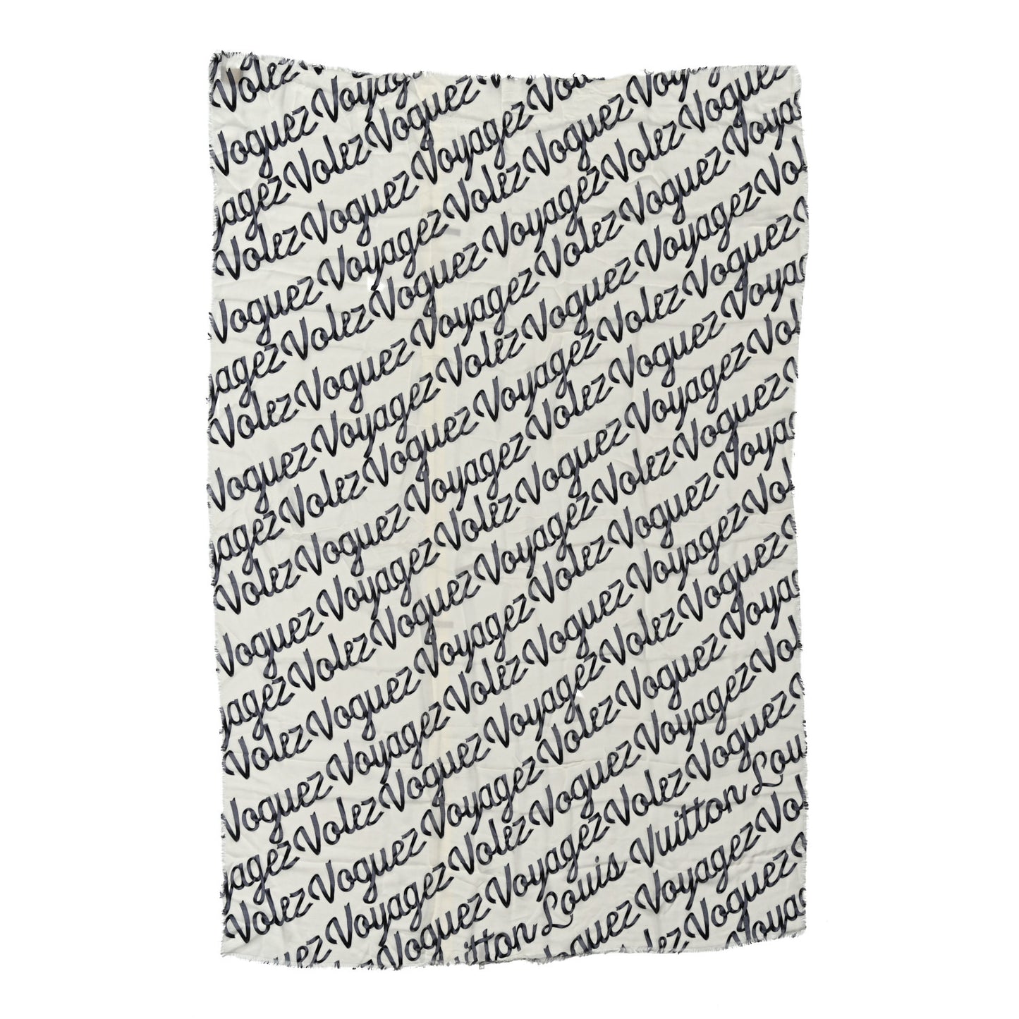 This is an authentic LOUIS VUITTON Silk Wool Volez Voguez Voyagez Stole. This stole is crafted of 50% wool and 50% silk in white. It features fringed edges and a cursive writing design in blue.Follow this item for alerts. Louis Vuitton is a registered trademark of Louis Vuitton. FASHIONPHILE is not affiliated with Louis Vuitton.