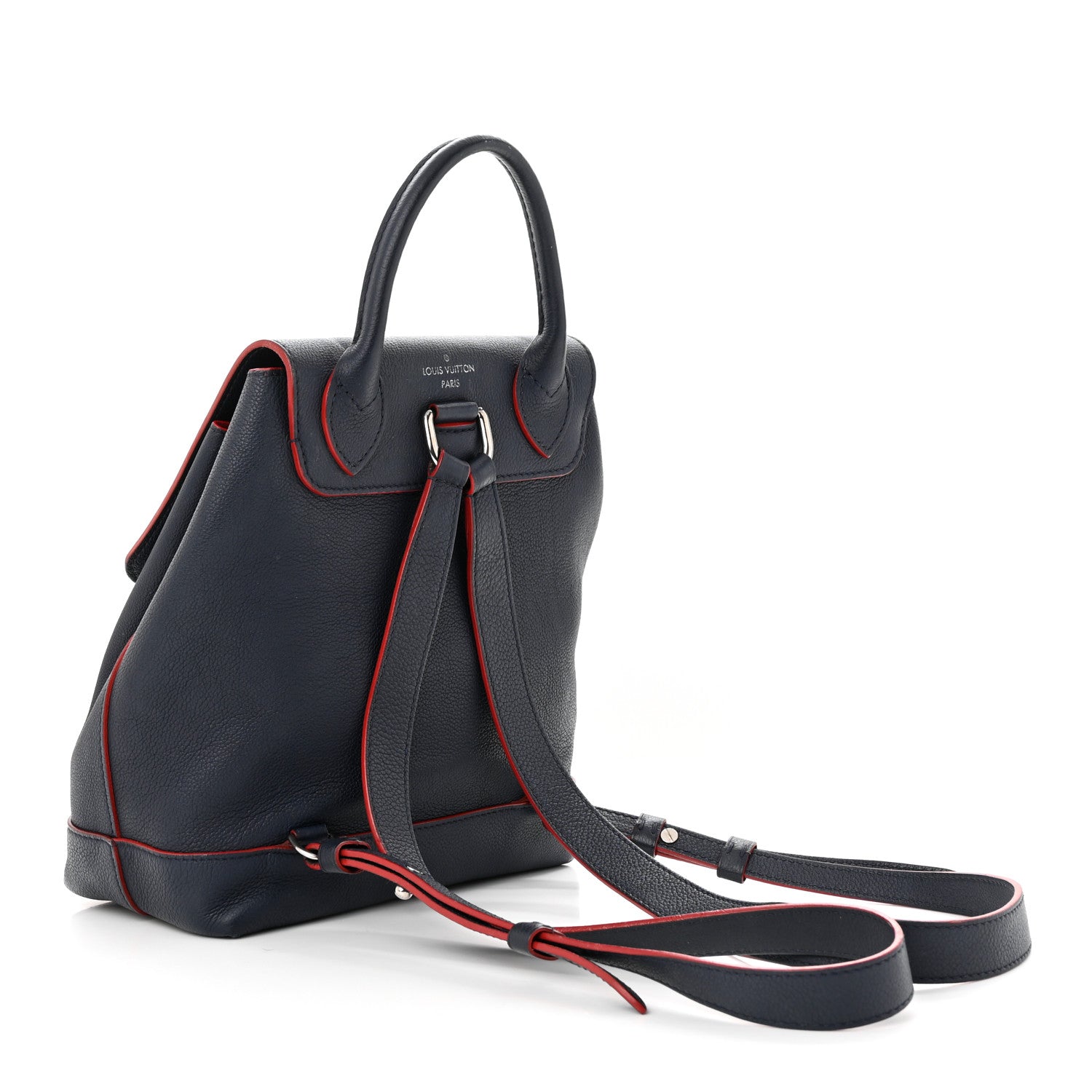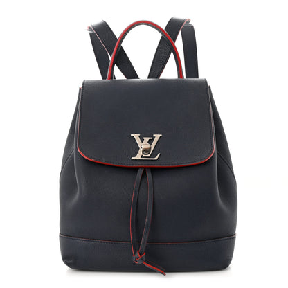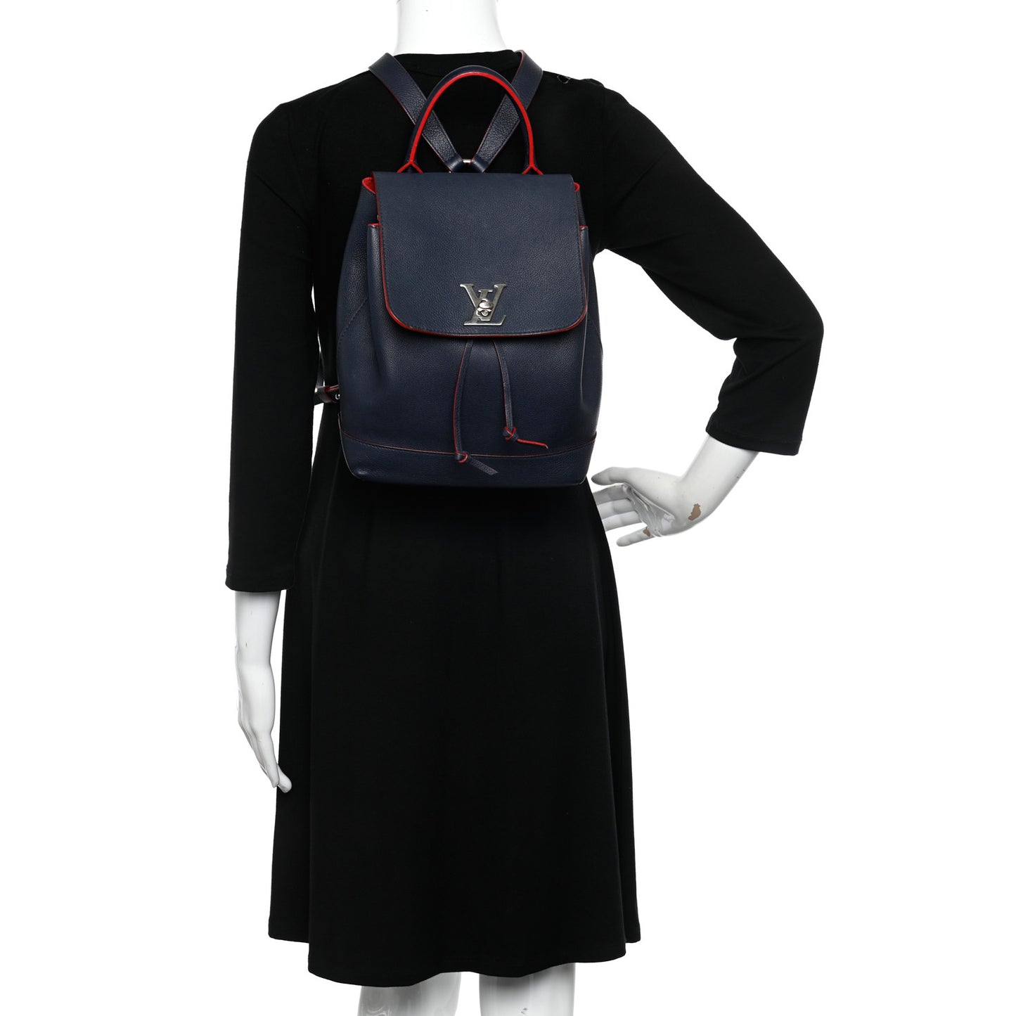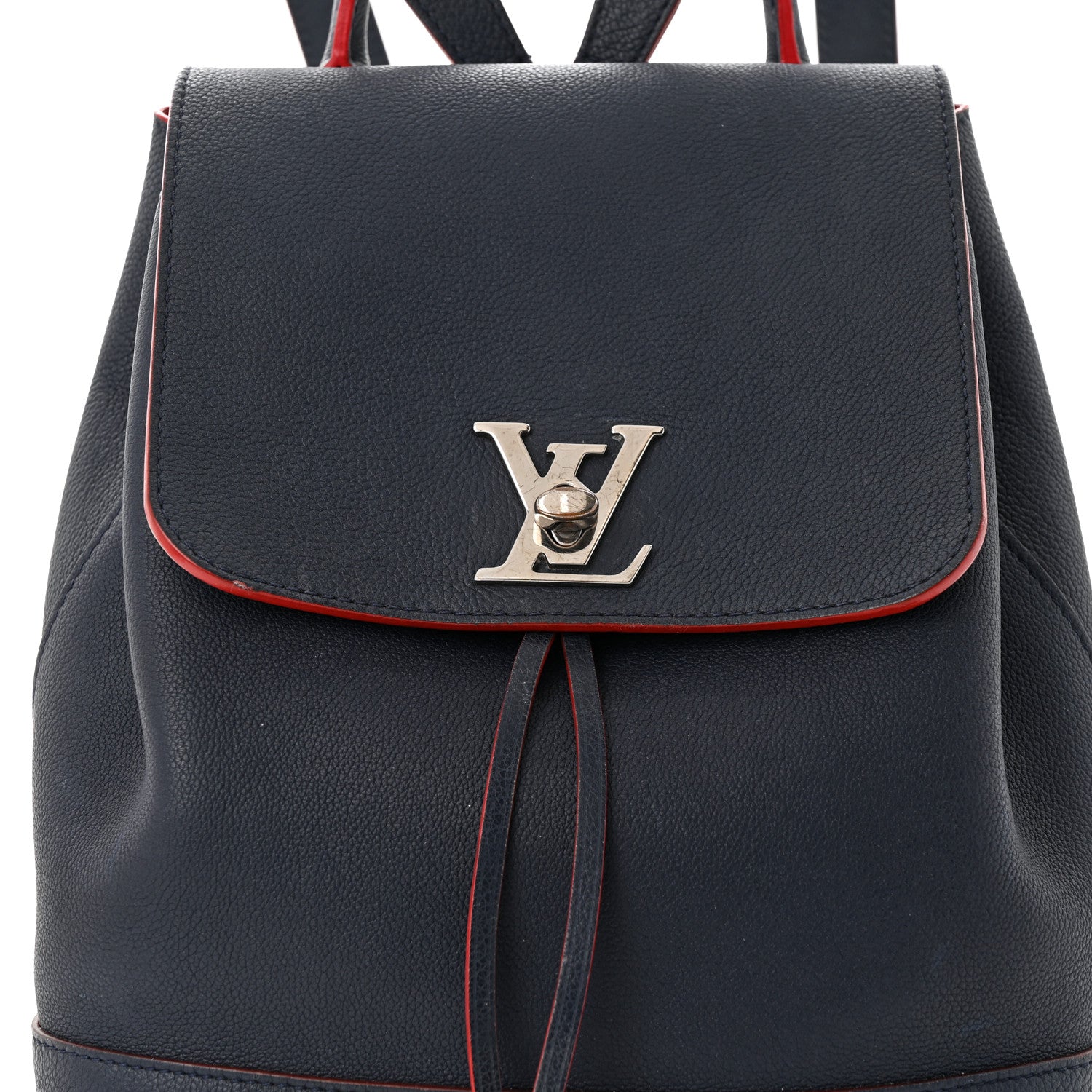 This is an authentic LOUIS VUITTON Soft Calfskin Lockme Backpack in Marine and Rouge. This chic small backpack is crafted of grained calfskin leather in navy with contrasting red resin glazing. The backpack features a calfskin handle, adjustable shoulder straps, top drawstring, and a front flap with a polished silver Louis Vuitton turn lock. This opens to a red microfiber interior with a large hanging pocket.Follow this item for alerts. Louis Vuitton is a registered trademark of Louis Vuitton. FASHIONPHILE is not affiliated with Louis Vuitton.