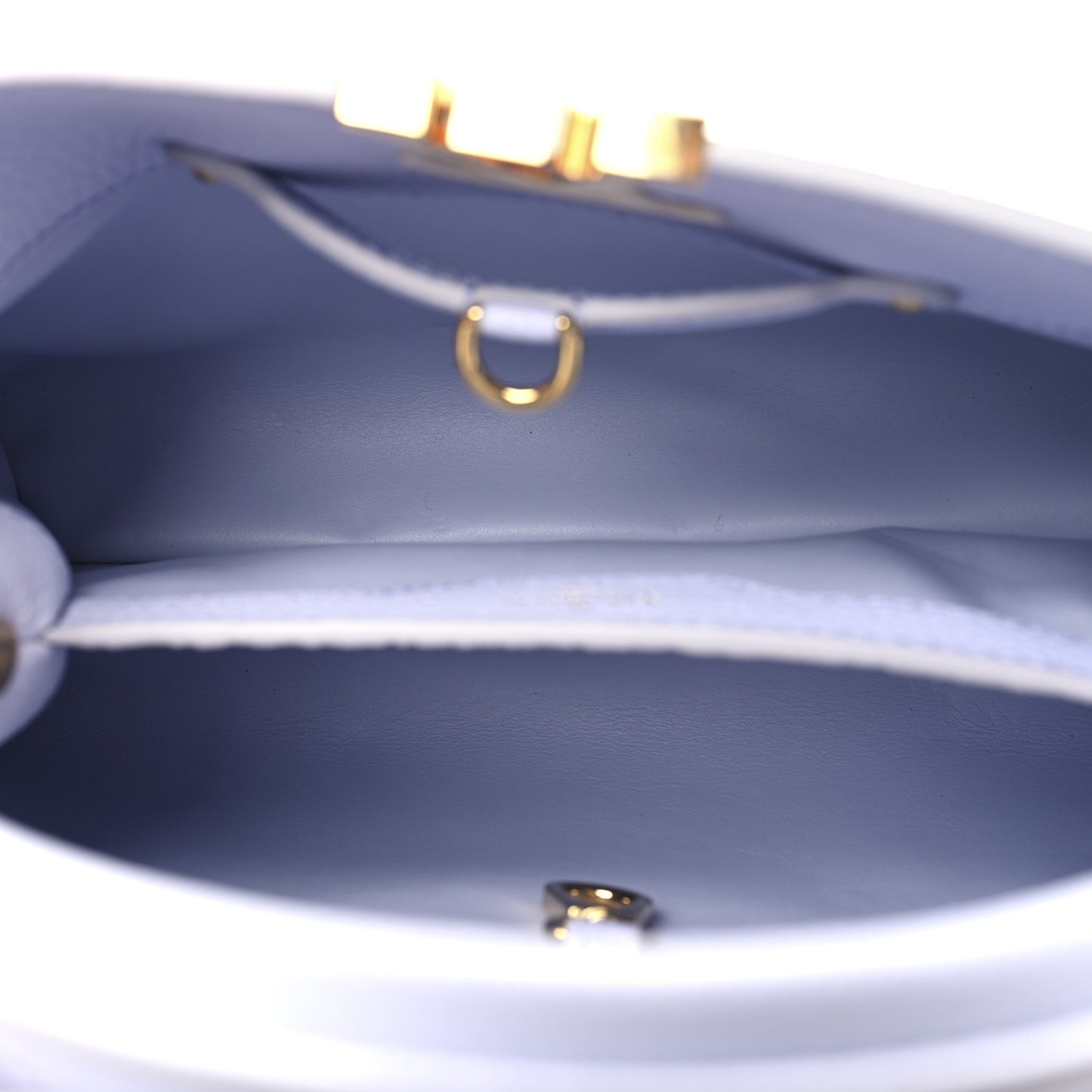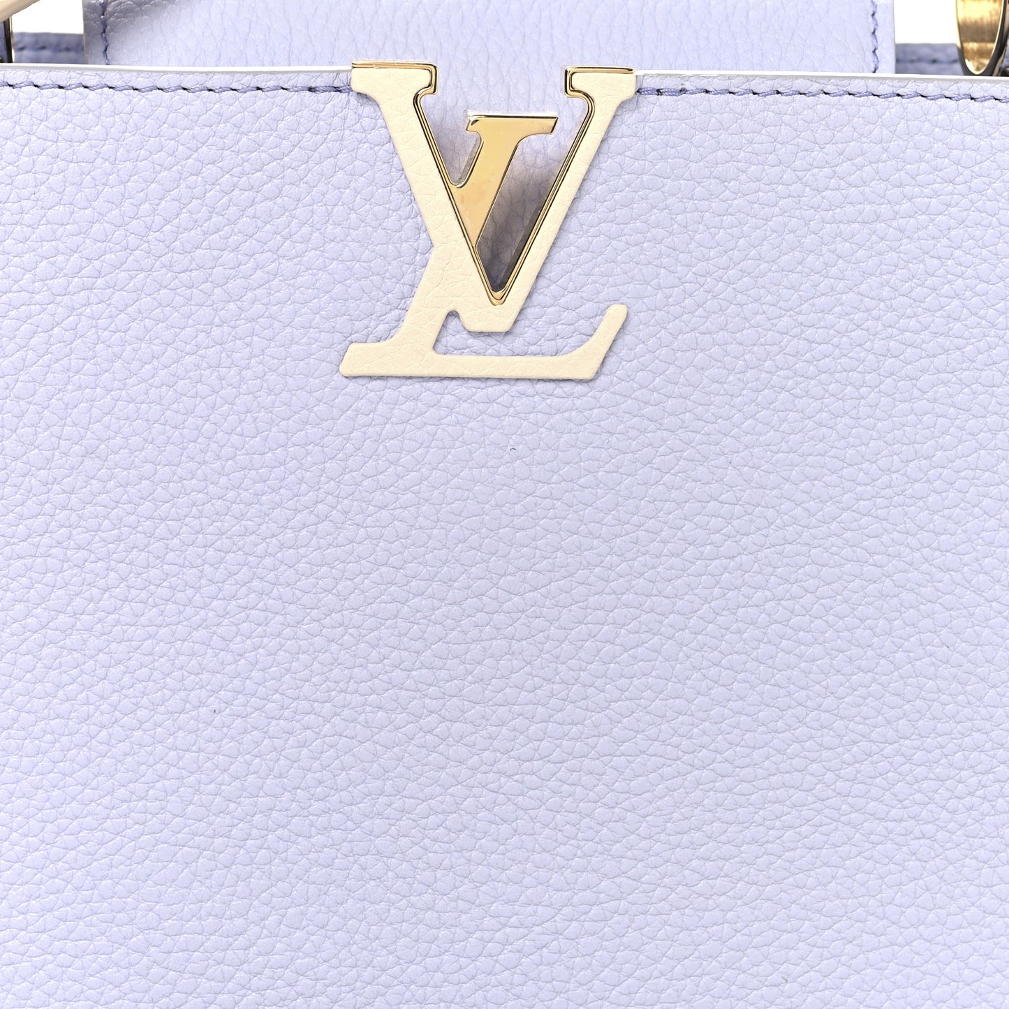 This authentic LOUIS VUITTON Taurillon Braided Chain Capucines BB in Iris and Creme. This beautiful bag is crafted of textured leather in light purple. This handbag features an optional leather braided chain shoulder strap, a flap closure, and gold hardware. The top opens to a purple leather interior with a zipper pocket.Follow this item for alerts. Louis Vuitton is a registered trademark of Louis Vuitton. FASHIONPHILE is not affiliated with Louis Vuitton.