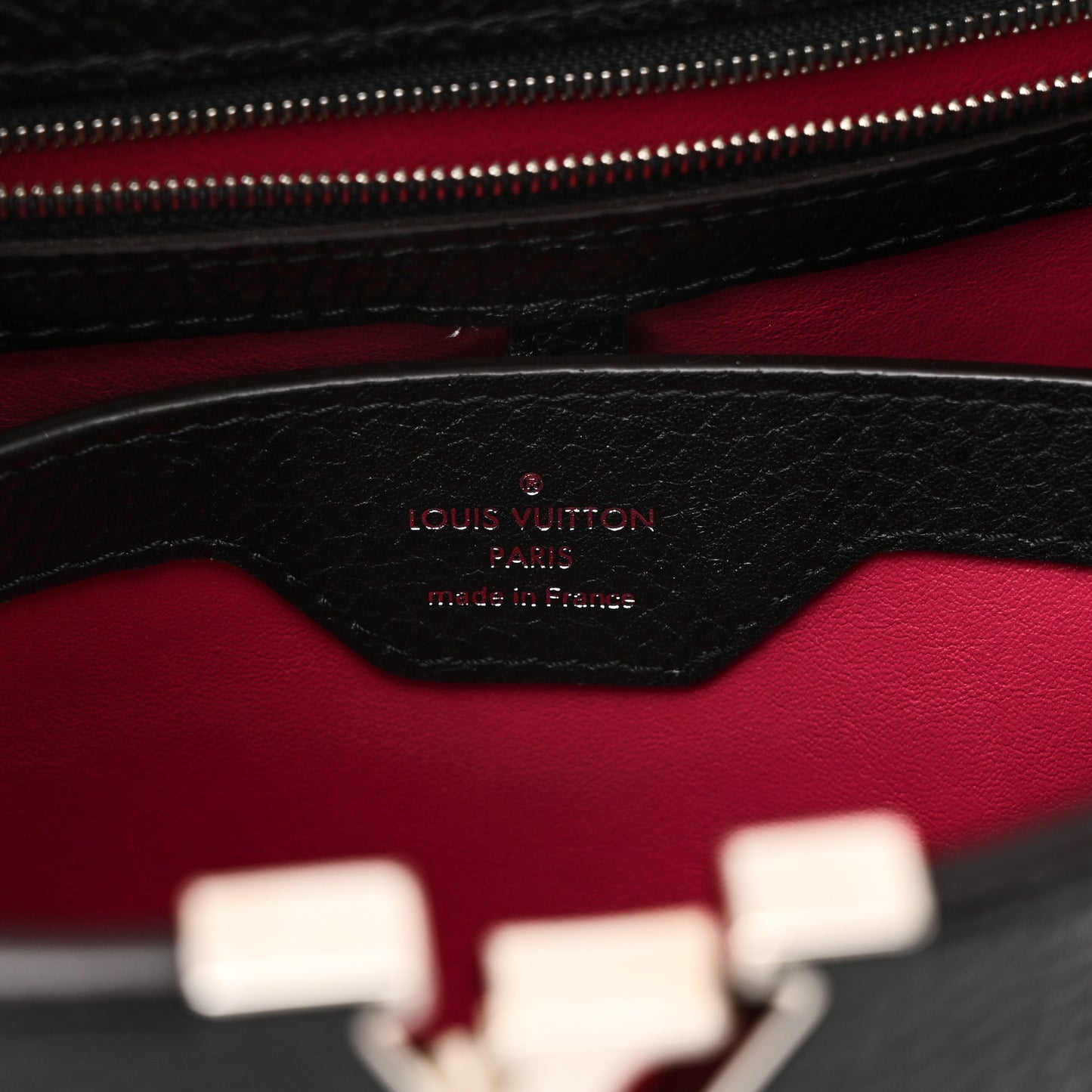 This authentic LOUIS VUITTON Taurillon Capucines BB in Black and Fuchsia. This beautiful bag is crafted of textured leather in black. This handbag features an leather top handle, optional shoulder strap, a flap closure, and gold hardware. The top opens to a pink leather interior with a zipper pocket.Follow this item for alerts. Louis Vuitton is a registered trademark of Louis Vuitton. FASHIONPHILE is not affiliated with Louis Vuitton.