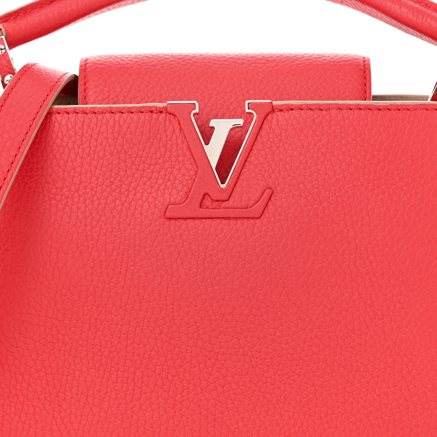 This is an authentic LOUIS VUITTON Taurillon Capucines BB in Rose Litchi. This handbag is crafted of textured taurillon calfskin leather in coral pink. The bag features a looping rolled leather top handle with silver ring links, and an optional shoulder strap. The crossover flap opens to a partitioned pink leather interior with a zipper pocket.Follow this item for alerts. Louis Vuitton is a registered trademark of Louis Vuitton. FASHIONPHILE is not affiliated with Louis Vuitton.