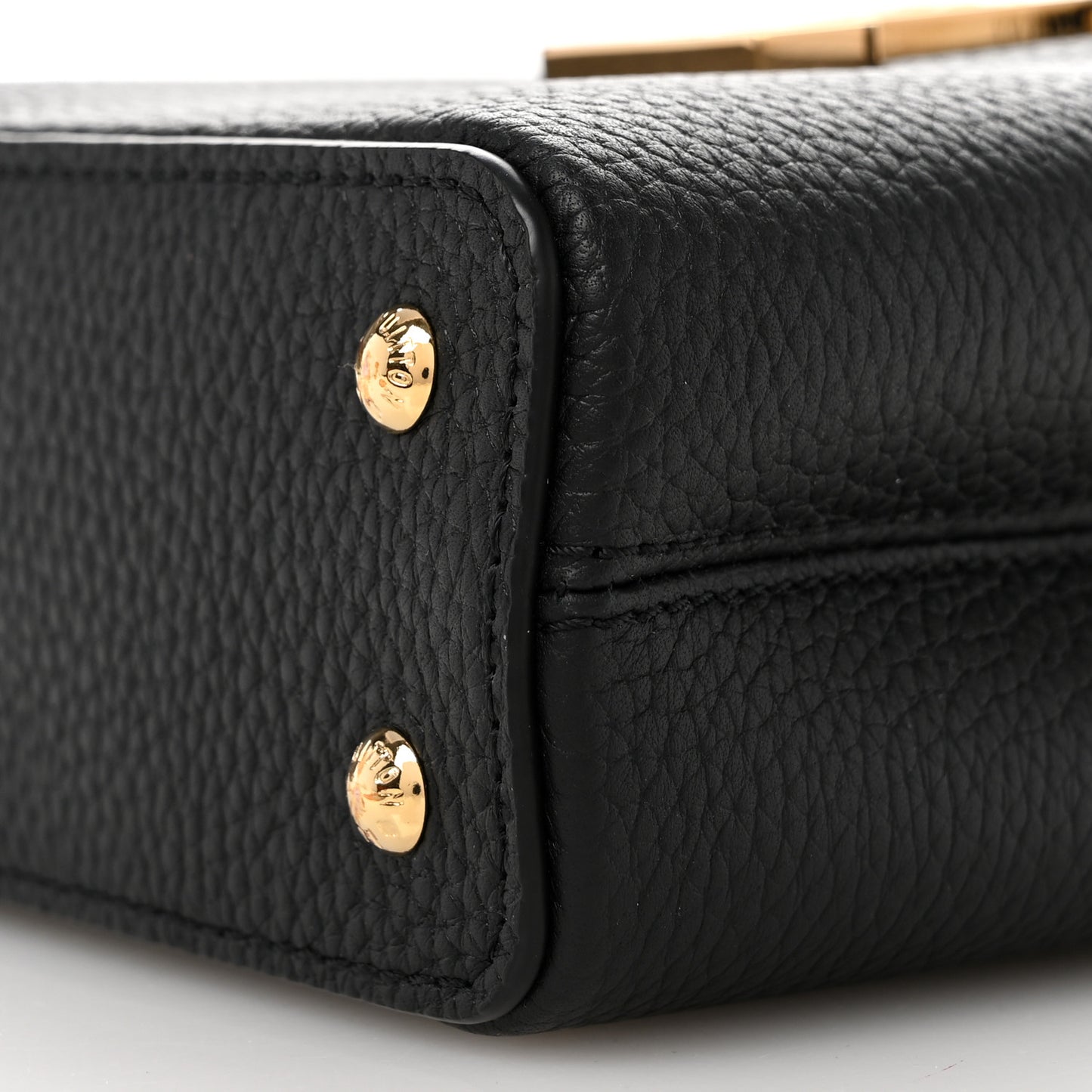 This authentic LOUIS VUITTON Taurillon Embellished Flower Crown Capucines Nano in Black. This beautiful bag is composed of grained calfskin. The handbag features a single rolled leather reinforced top handle, a leather threaded gold chain strap, stylized links and a crossover flap that inserts behind the prominent resin LV. The top flap opens to a partitioned leather interior with a patch pocket and removable mirror.Follow this item for alerts. Louis Vuitton is a registered trademark of Louis Vuitton. FASHIONPHILE is not affiliated with Louis Vuitton.