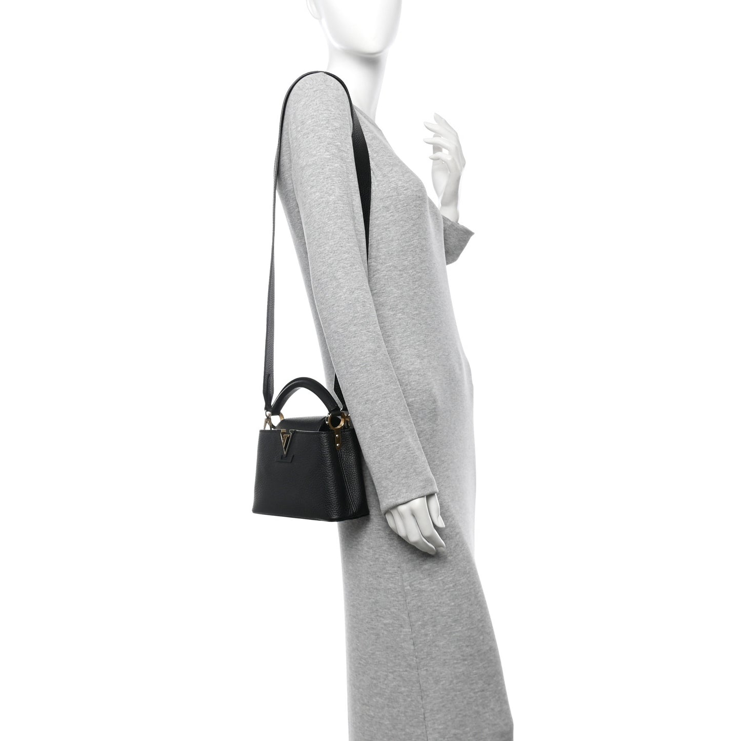This is an authentic LOUIS VUITTON Taurillon Mini Capucines in Black. This classic handbag is crafted of textured calfskin leather in black. It features a single rolled leather top handle with stylized links, an optional shoulder strap, and a crossover flap that inserts behind the prominent gold hardware and black leather LV on the front. This opens to a partitioned smooth black leather interior with a flat pocket.Follow this item for alerts. Louis Vuitton is a registered trademark of Louis Vuitton. FASHIONPHILE is not affiliated with Louis Vuitton.