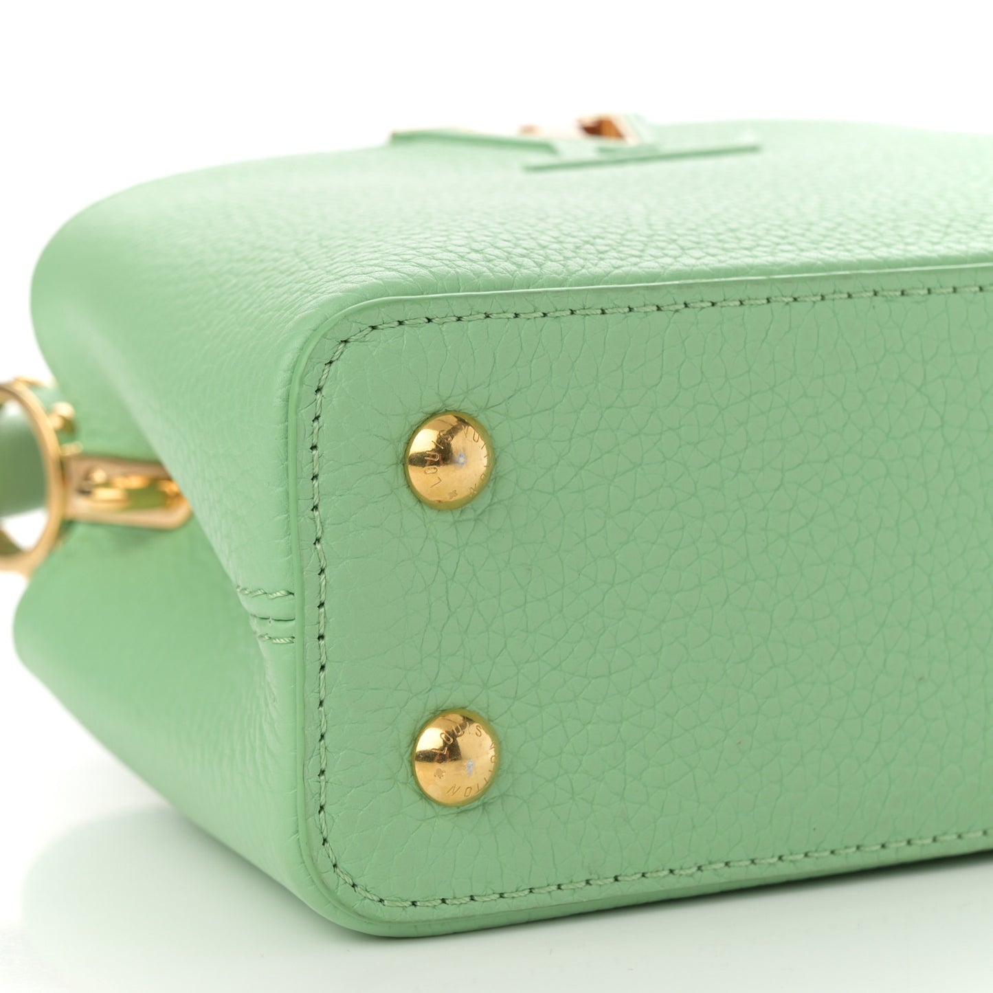 This is an authentic LOUIS VUITTON Taurillon Mini Capucines in Vert Pomme. This beautiful handbag is crafted of luxurious textured calfskin leather in light green. The bag features a single rolled leather top handle with stylized links, a removable, adjustable shoulder strap, and a crossover flap that inserts behind the prominent green and gold LV. This opens to a partitioned pink leather interior with a flat pocket.Follow this item for alerts. Louis Vuitton is a registered trademark of Louis Vuitton. FASHIONPHILE is not affiliated with Louis Vuitton.