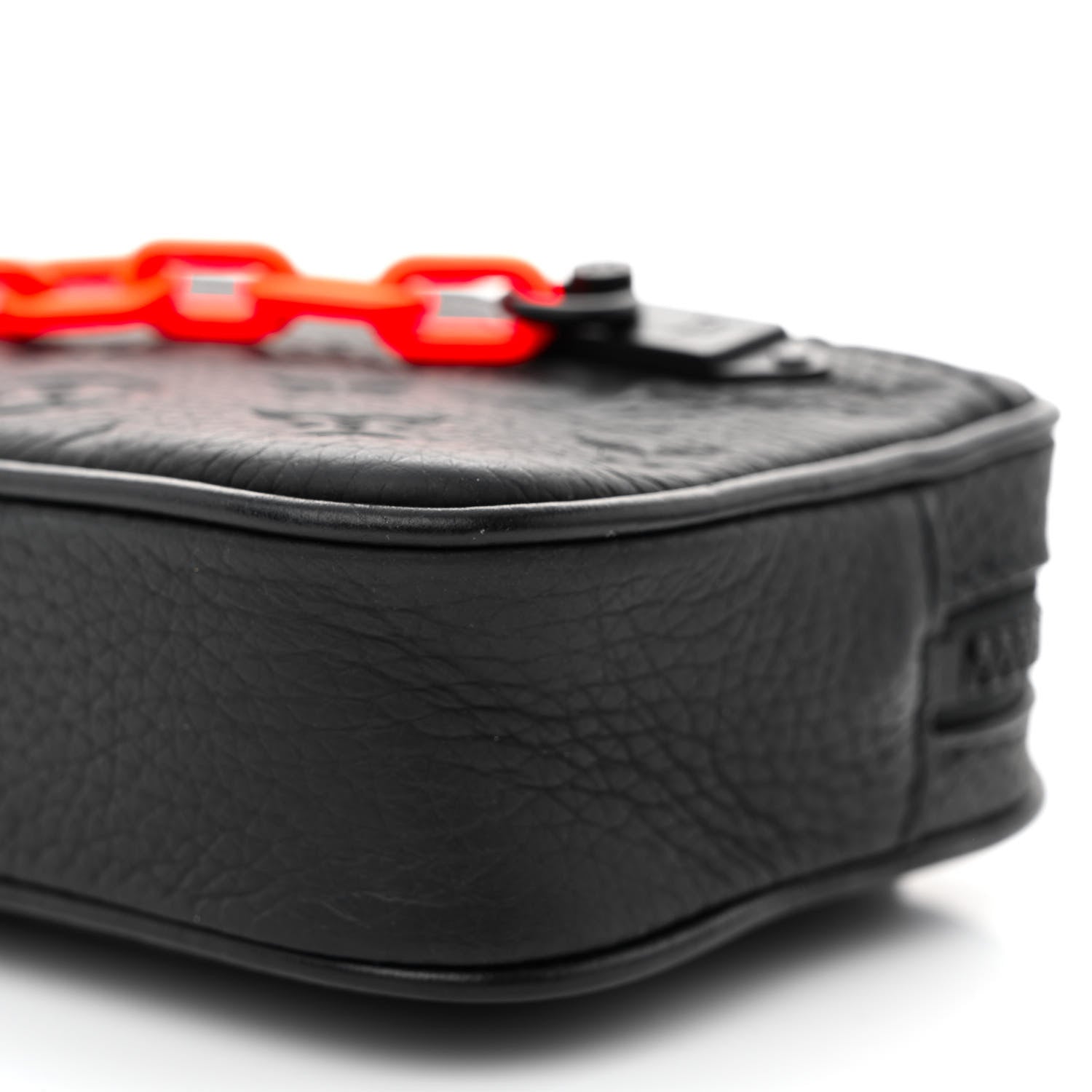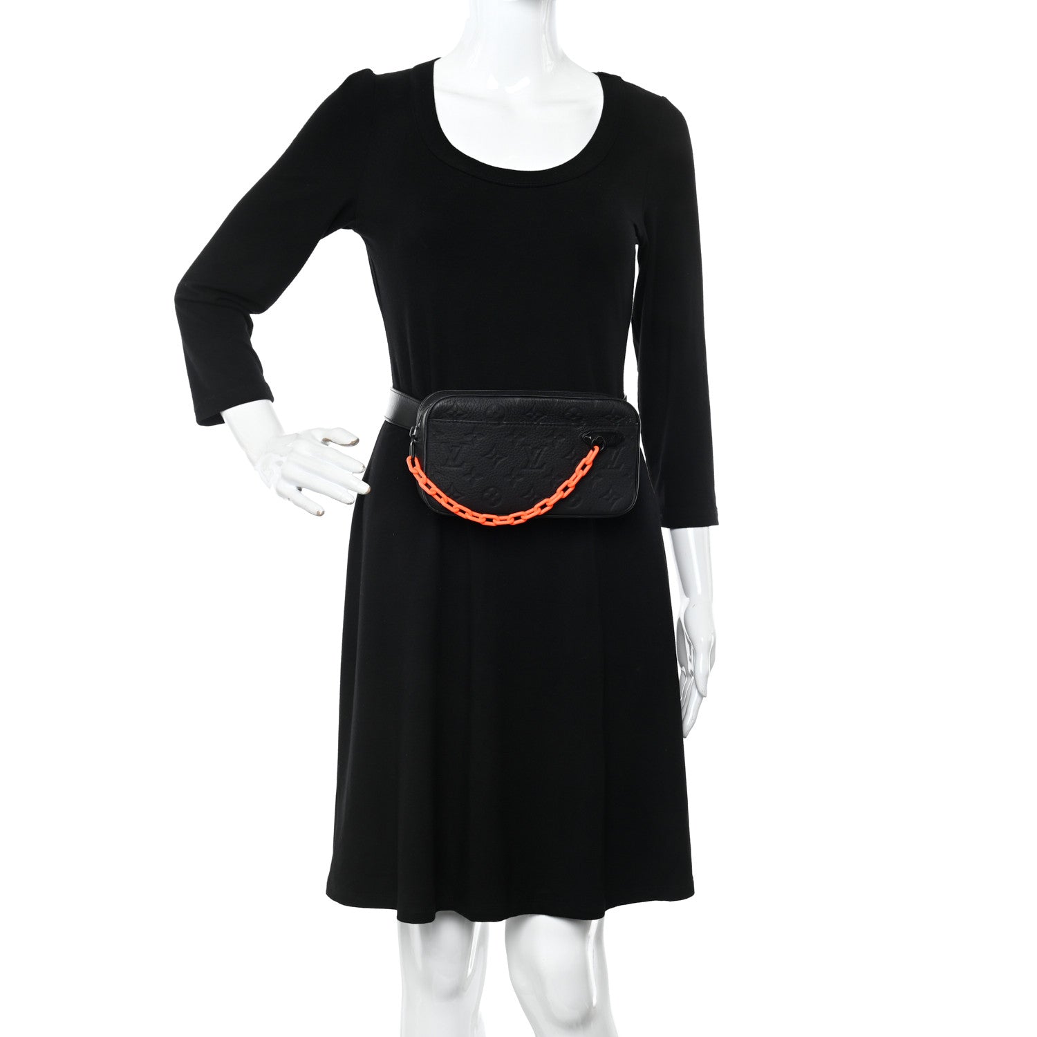 This is an authentic LOUIS VUITTON Taurillon Monogram Uniformes Solar Ray Soft Pochette Volga Belt Bag in Black. This pouch from Virgil Abloh's collection is featured in Louis Vuitton monogram embossed leather in matte black. The pochette features a matte neon orange chain-link strap attached to the zipper, black hardware, and belt strap. The top zipper opens to a black fabric interior.Follow this item for alerts. Louis Vuitton is a registered trademark of Louis Vuitton. FASHIONPHILE is not affiliated with Louis Vuitton.