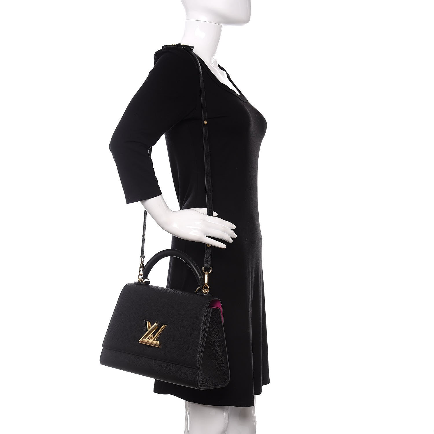 This is an authentic LOUIS VUITTON Taurillon Twist One Handle MM in Black. This stylish handbag is crafted of textured leather in black. The bag features a sturdy top handle and an optional shoulder strap with polished gold LV twist lock on the facing flap. The flap opens to a fuschia leather interior with patch pockets. This stunning shoulder bag is lovely for day or evening, with the luxury and style of Louis Vuitton!Follow this item for alerts. Louis Vuitton is a registered trademark of Louis Vuitton. FASHIONPHILE is not affiliated with Louis Vuitton.