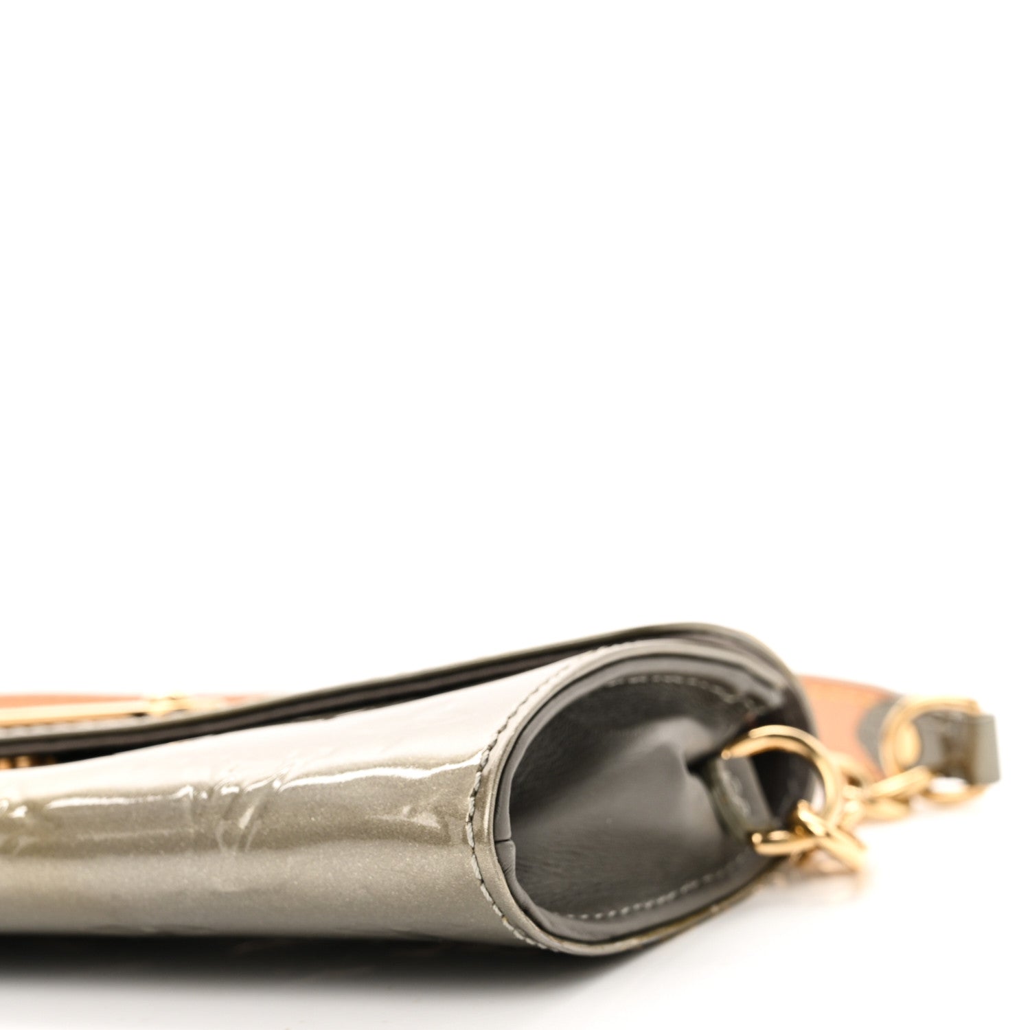 This is an authentic LOUIS VUITTON Vernis Sunset Boulevard in Gris Art Deco. This stylish handbag is crafted of Louis Vuitton monogram embossed vernis patent leather in grey. The bag features a removable gold chain link strap with a leather shoulder pad and a rounded front flap. This opens to a fabric and matte leather interior with a zipper compartment and a panel lined with card slots.Follow this item for alerts. Louis Vuitton is a registered trademark of Louis Vuitton. FASHIONPHILE is not affiliated with Louis Vuitton.