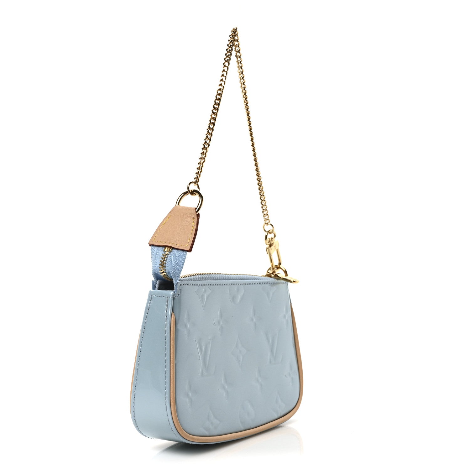 This is an authentic LOUIS VUITTON Vernis Valentine Mini Pochette Accessories in Lollipop Blue. This mini pochette is crafted of Louis Vuitton monogram embossed patent leather in light blue. The pochette features vachetta leather trim and gold hardware, including a chain strap. The top zipper opens to a matching blue microfiber interior.Follow this item for alerts. Louis Vuitton is a registered trademark of Louis Vuitton. FASHIONPHILE is not affiliated with Louis Vuitton.