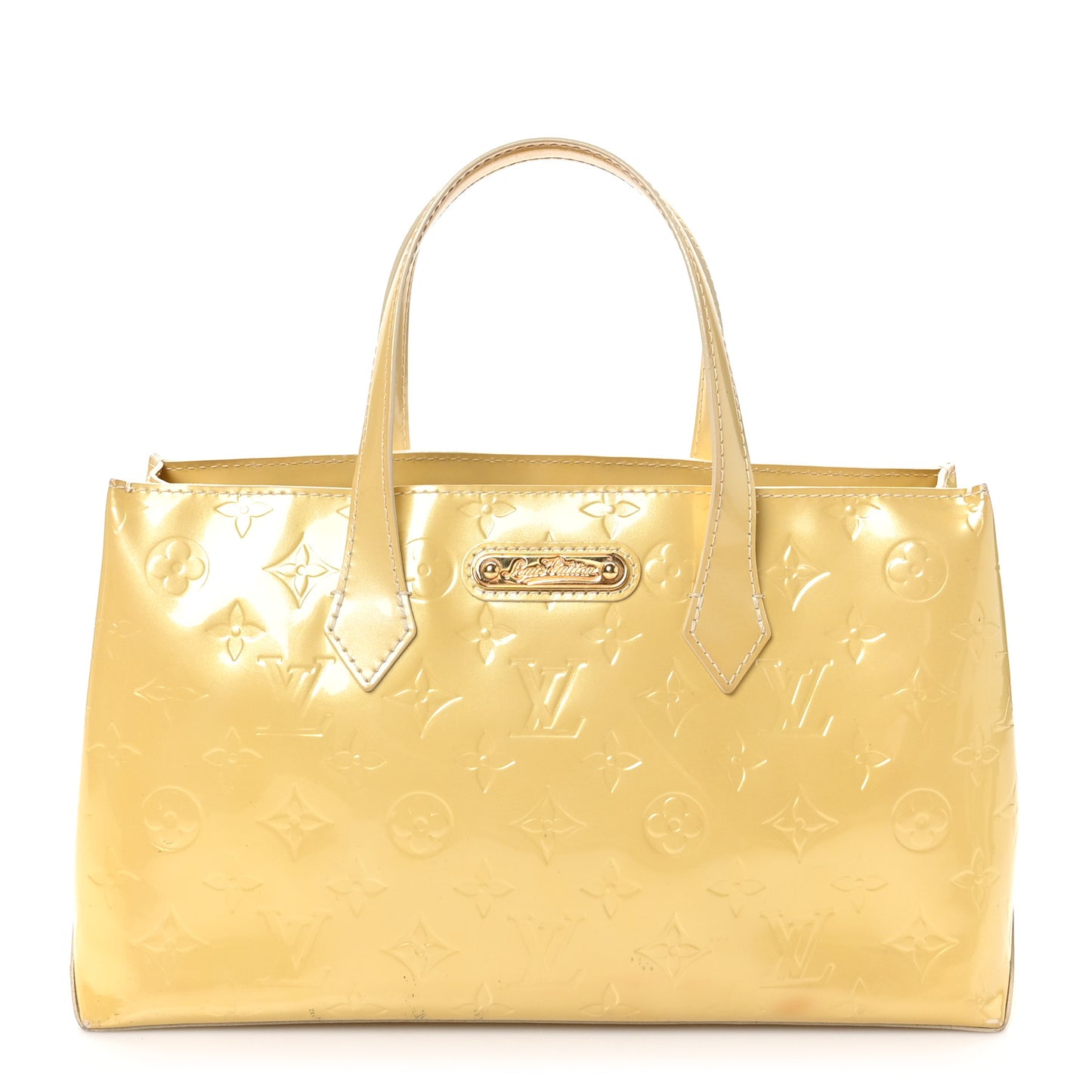 This is an authentic LOUIS VUITTON Vernis Wilshire PM in Blanc Corail. This stylish tote is crafted of Louis Vuitton monogram embossed patent leather in off white. The bag features patent leather strap top handles and a broad open top revealing an ivory fabric interior with a zipper pocket.Follow this item for alerts. Louis Vuitton is a registered trademark of Louis Vuitton. FASHIONPHILE is not affiliated with Louis Vuitton.