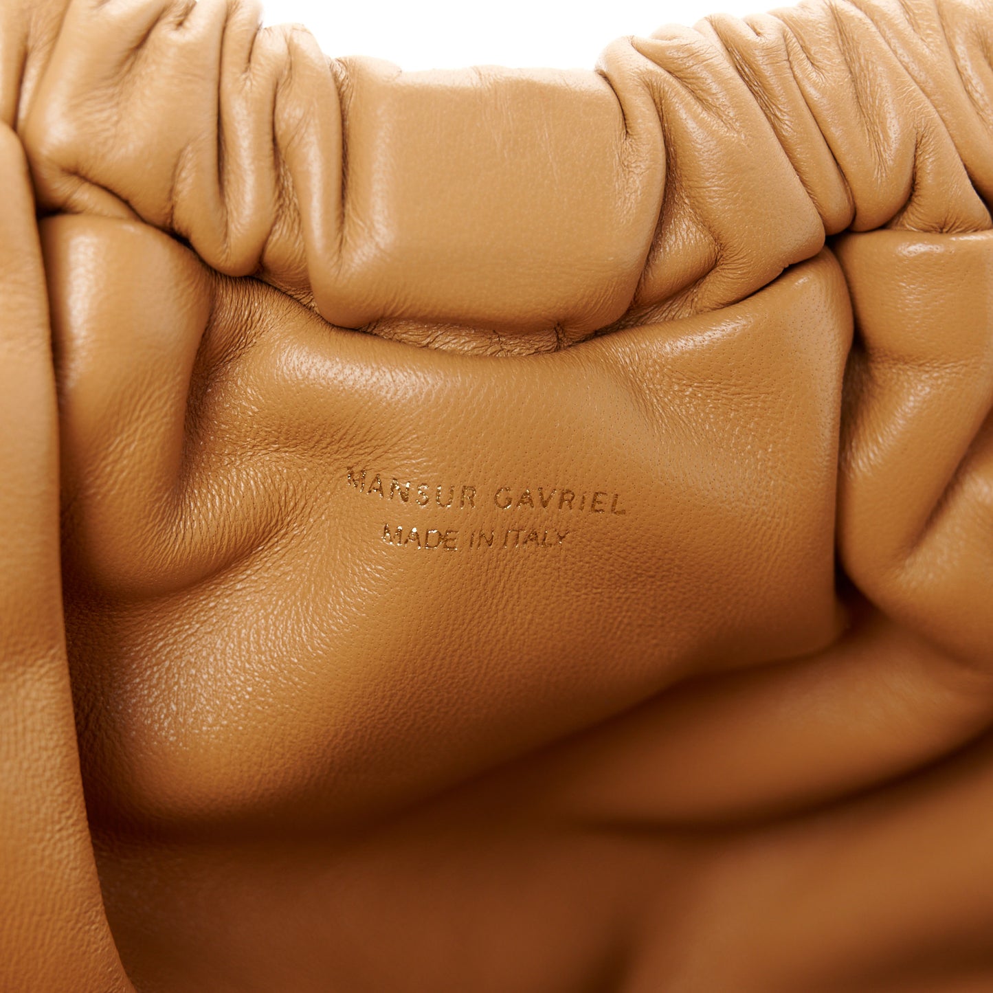This is an authentic MANSUR GAVRIEL Lambskin Cloud Mini Clutch in Caramel. This clutch is crafted of lambskin leather in brown. The bag features a long shoulder strap and a ruched magnetic top frame that opens to a matching leather interior.Follow this item for alerts. Mansur Gavriel is a registered trademark of Mansur Gavriel. FASHIONPHILE is not affiliated with Mansur Gavriel.
