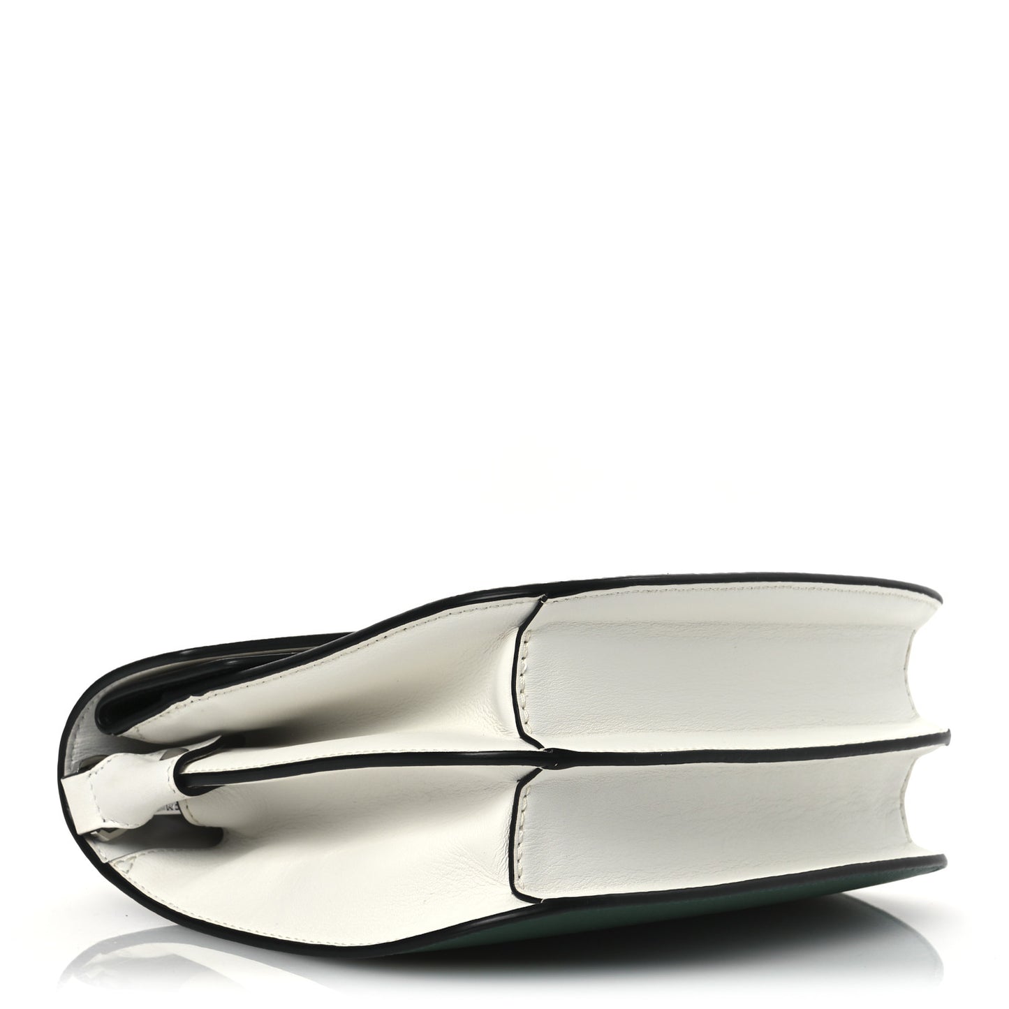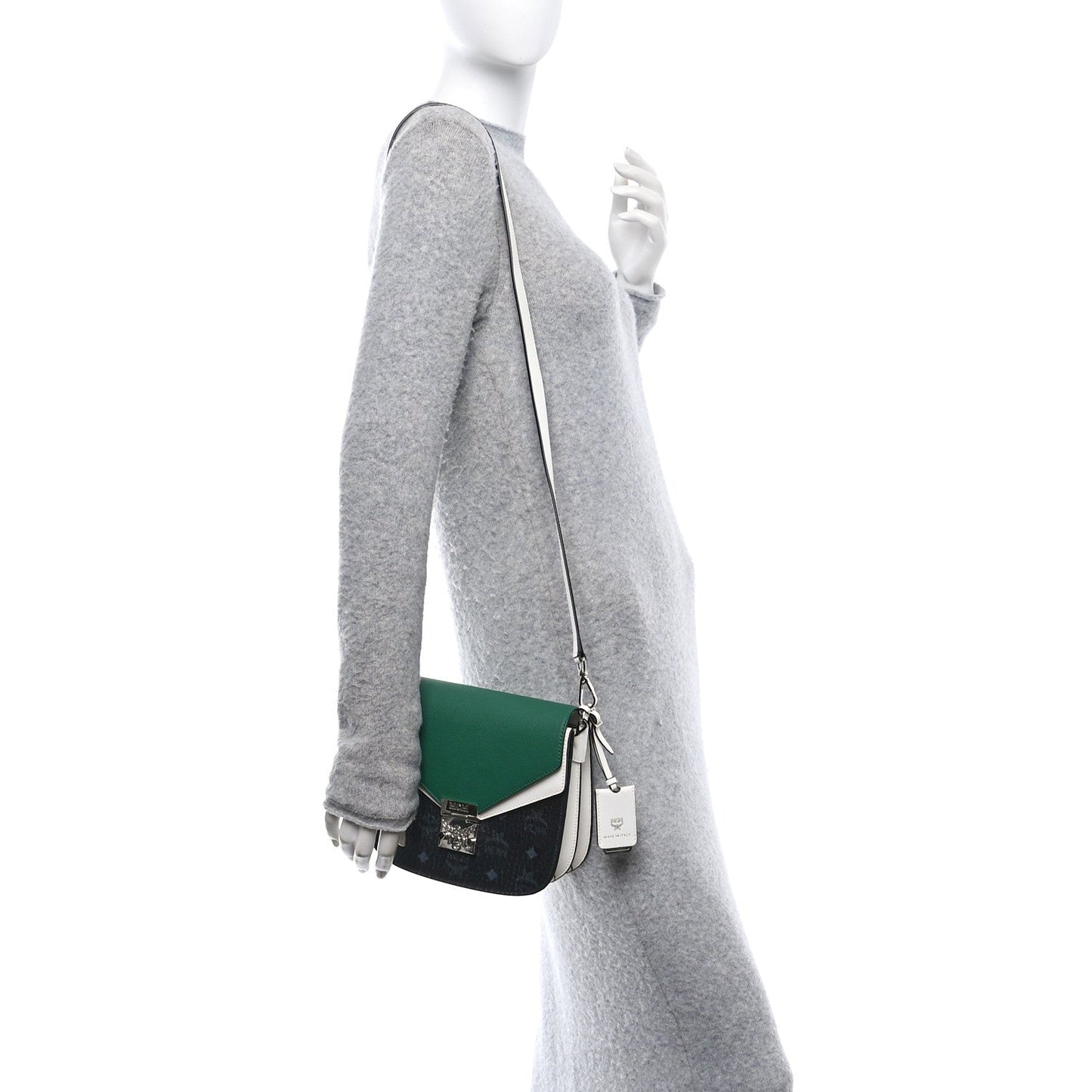 This is an authentic MCM Visetos Calfskin Small Patricia Crossbody Bag in Eden and Black. This crossbody bag is crafted of smooth calfskin leather in green and white with black MCM monogram coated canvas. It features an adjustable white leather crossbody strap and silver press lock that opens the flap to a partitioned brown suede interior with a front flap pocket and zippered pocket.Follow this item for alerts. MCM is a registered trademark of MCM. FASHIONPHILE is not affiliated with MCM.