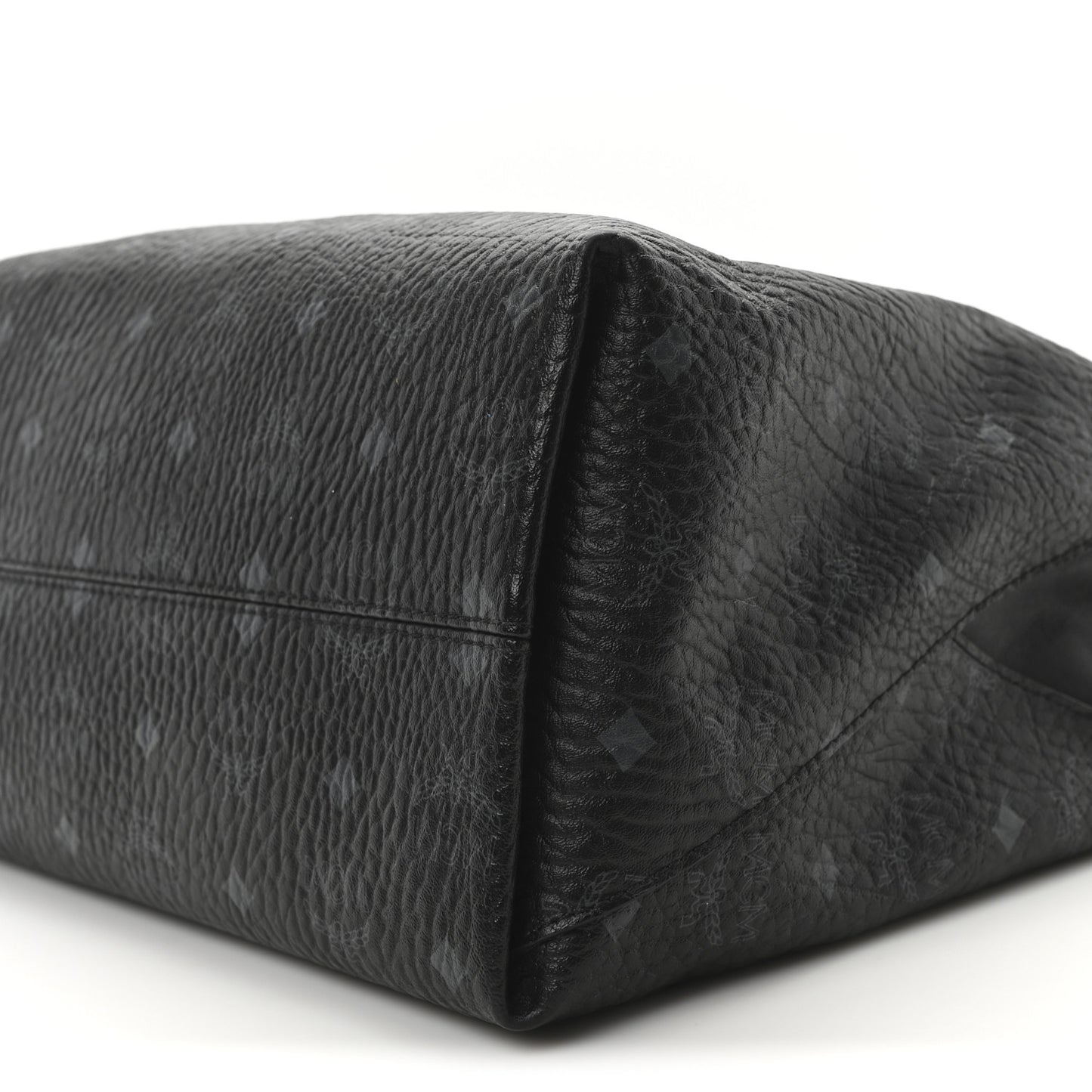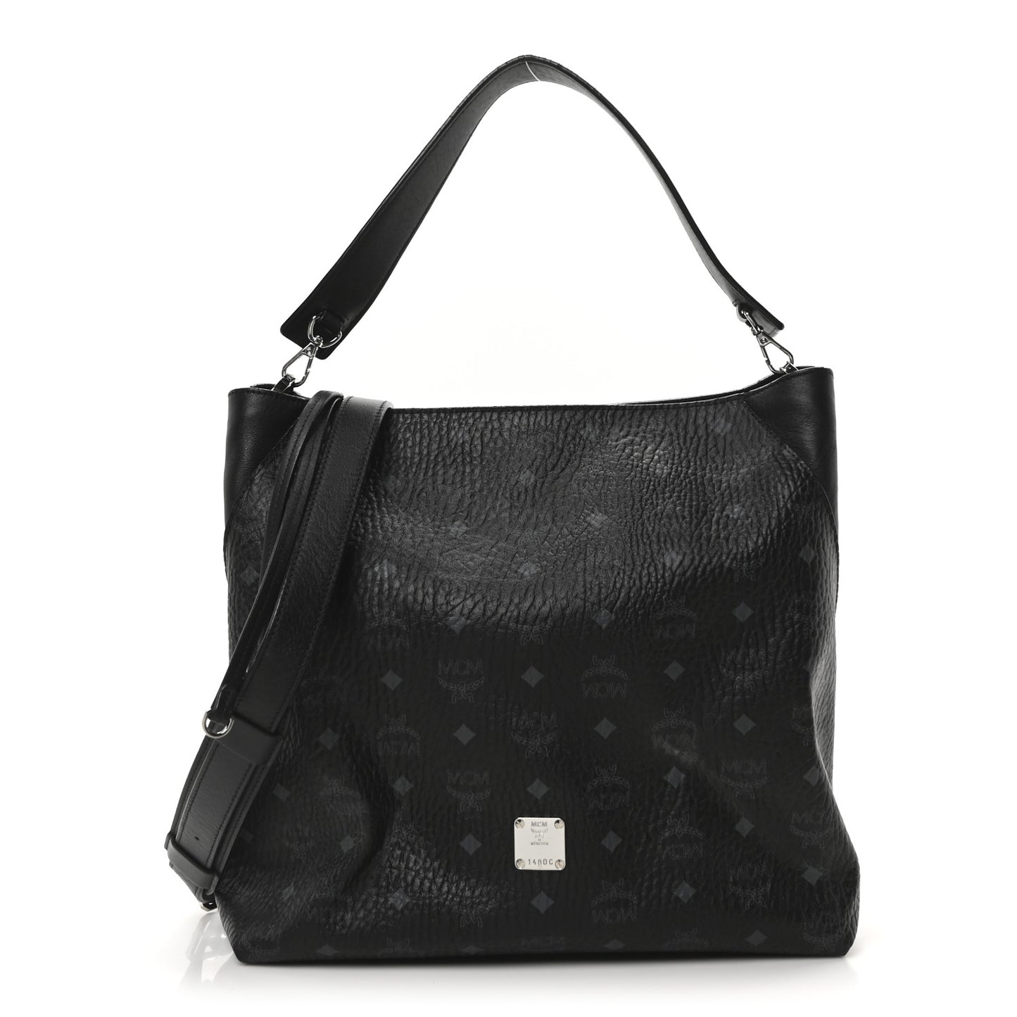 This is an authentic MCM Visetos Large Klara Hobo in Black. This sophisticated tote is finely crafted of coated canvas in black and with the classic black MCM monogram print. This shoulder bag also has an optional leather shoulder strap, and dark silver hardware. The top zipper opens to a fabric interior with zipper and patch pockets.Follow this item for alerts. MCM is a registered trademark of MCM. FASHIONPHILE is not affiliated with MCM.