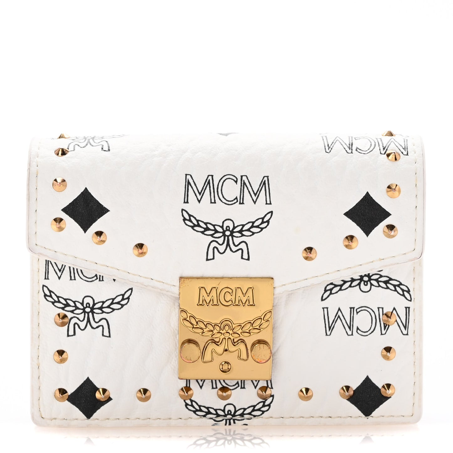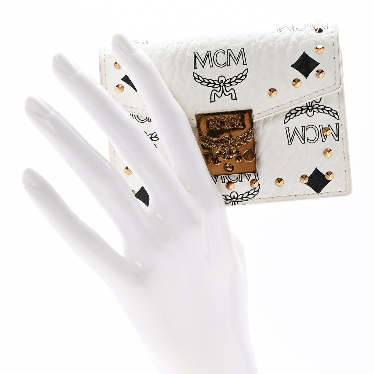 This is an authentic MCM Visetos Mini Accordion Card Wallet in White. This sophisticated wallet is finely crafted of leather in white with black MCM logos throughout and gold hardware. The wallet features a flap that opens to card slots and a zipper pocket.Follow this item for alerts. MCM is a registered trademark of MCM. FASHIONPHILE is not affiliated with MCM.