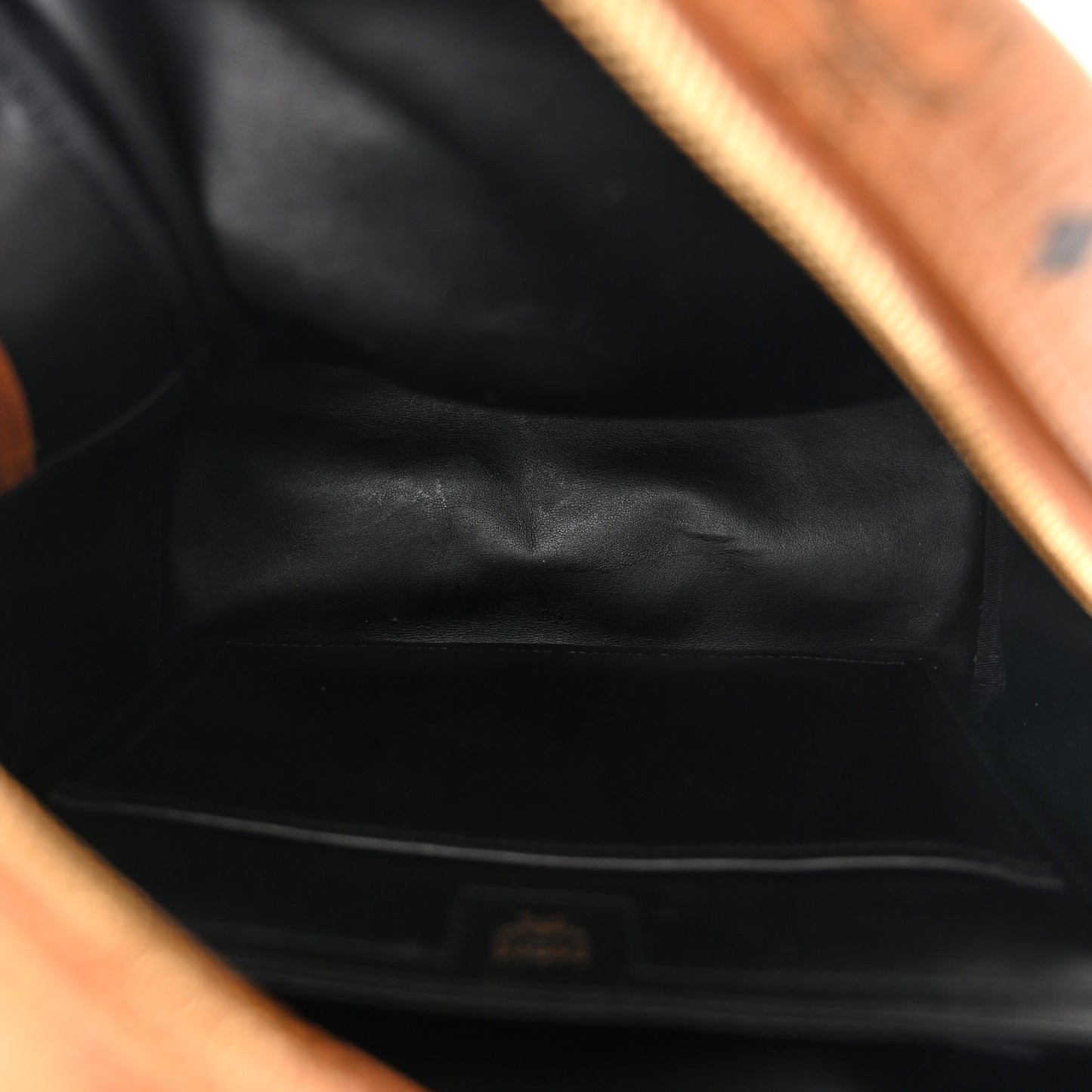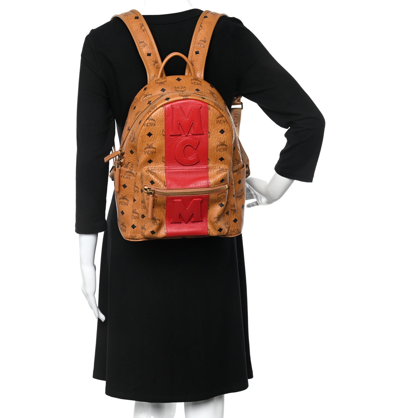 This is an authentic MCM Visetos Small Stark Logo Stripe Backpack in Cognac and Red. This stylish backpack is crafted of brown visetos coated canvas with the MCM logo in black. The pack features a red stripe down the front with a large MCM logo, a front pocket and adjustable shoulder straps. The top zipper opens to a black leather interior with pockets.Follow this item for alerts. MCM is a registered trademark of MCM. FASHIONPHILE is not affiliated with MCM.
