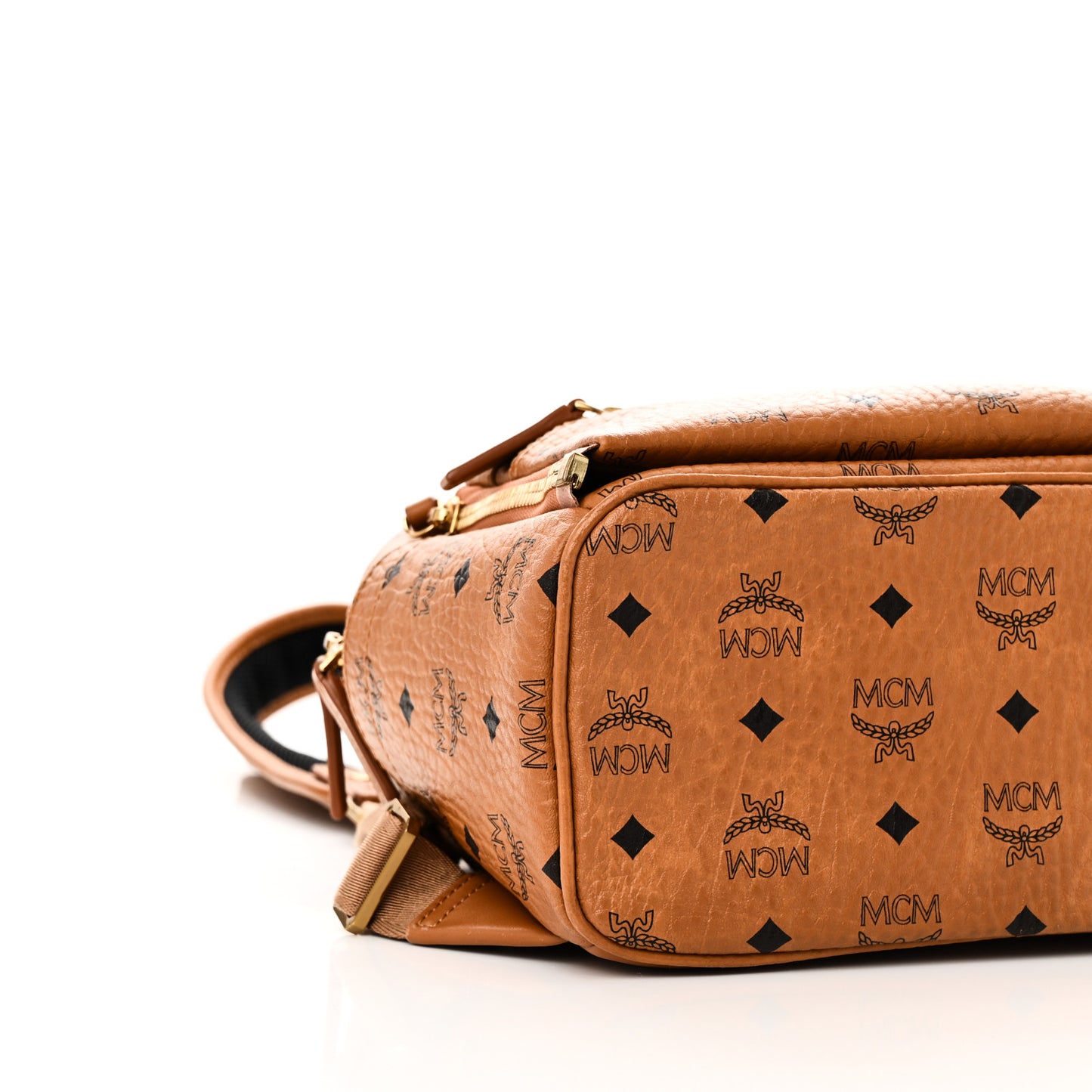 This is an authentic MCM Visetos Studded Medium Dual Stark Backpack in Cognac. This backpack features a body of sturdy MCM logo print on brown coated canvas. The backpack also features side pockets, a front zipper pocket, a removable pouch on the front pocket, a strong rolled top handle, and adjustable shoulder straps. The two-way zip-around top opens to a black interior with patch pockets and a compartment for a laptop.Follow this item for alerts. MCM is a registered trademark of MCM. FASHIONPHILE is not affiliated with MCM.