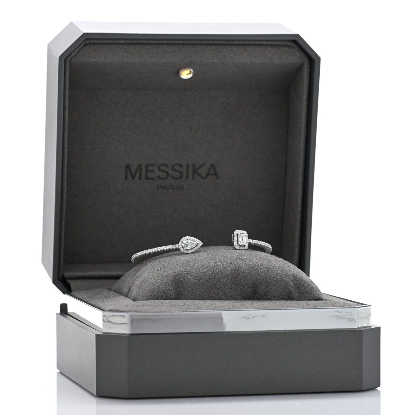 This is an authentic MESSIKA 18K White Gold Diamond .80ctw My Twin Toi & Moi Skinny Bangle Bracelet. The bracelet is crafted of 18 karat white gold and features a flexible open cuff set with emerald and pear cut diamonds, approximately .80 total carat weight (.40ct each), along with approximately .60 total carat weight of additional pave diamonds.Follow this item for alerts. Messika is a registered trademark of Messika. FASHIONPHILE is not affiliated with Messika.