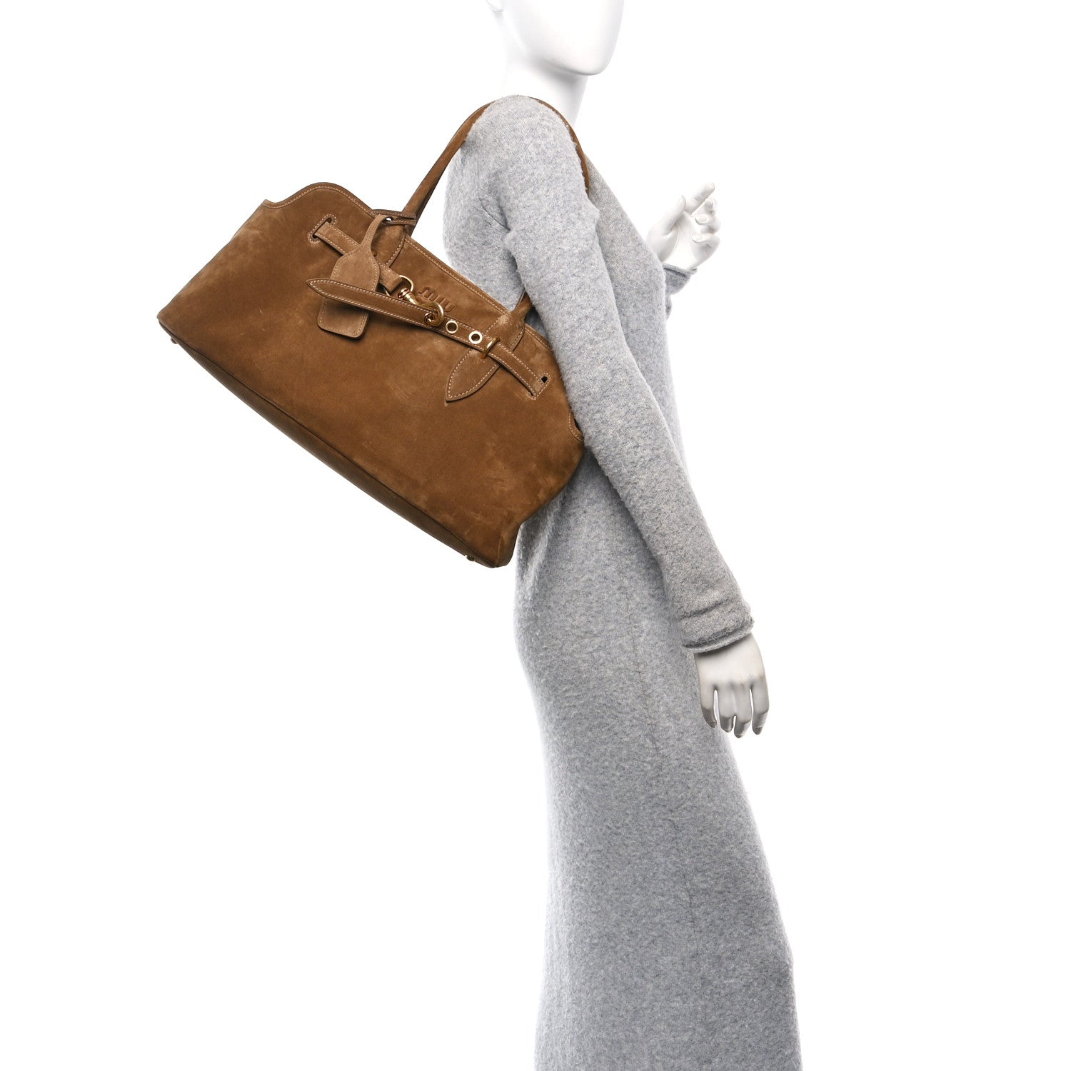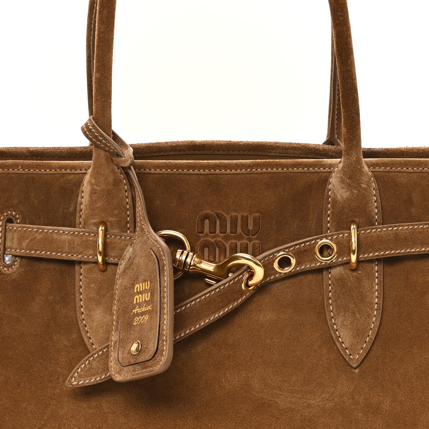 This is an authentic MIU MIU Camoscio Large Aventure Bag in Olive Green. This stylish bag is inspired by the iconic style of 2009, crafted of olive green suede leather. The bag features rolled shoulder straps, a top cinching strap with aged gold clasps, and an embossed Miu Miu logo. The top opens to a beige fabric interior with a zipper pocket and leather patch pockets.Follow this item for alerts. Miu Miu is a registered trademark of Miu Miu. FASHIONPHILE is not affiliated with Miu Miu.