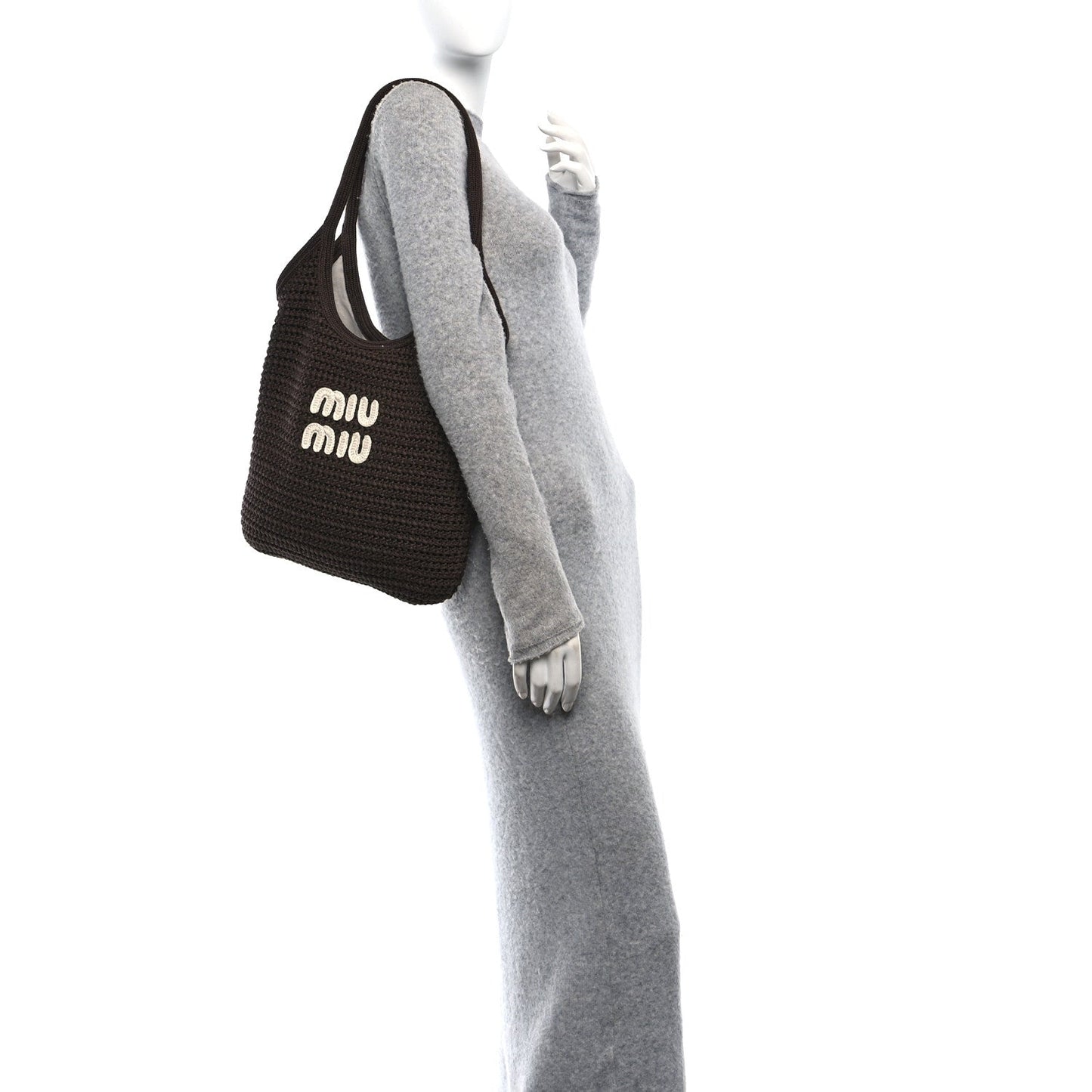 This is an authentic MIU MIU Cotton Crochet Ivy Tote Bag in Cacao and Talco. This woven shoulder bag is crafted of crocheted cotton yarn in dark brown with a white "miu miu" logo on the front. It features matching top straps and a canvas interior with a d-ring.Follow this item for alerts. Miu Miu is a registered trademark of Miu Miu. FASHIONPHILE is not affiliated with Miu Miu.