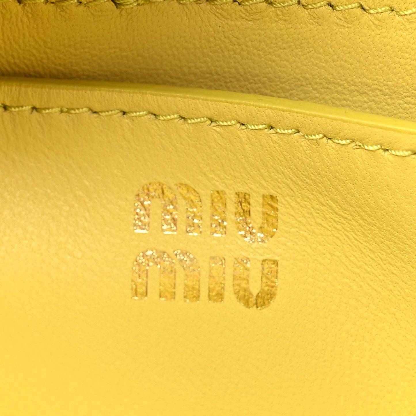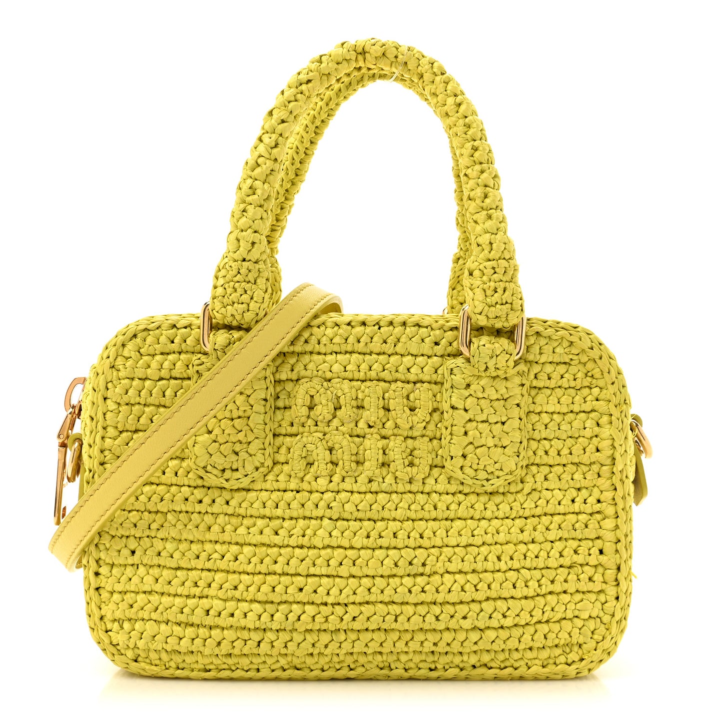 This an authentic MIU MIU Crochet Calfskin S Narrow Arcadie in Cedro. This chic baguette is crafted of raffia in green. This handbag features matching looping top handles and a crochet front logo. The top zipper opens to a matching interior with a leather patch pocket.Follow this item for alerts. Miu Miu is a registered trademark of Miu Miu. FASHIONPHILE is not affiliated with Miu Miu.