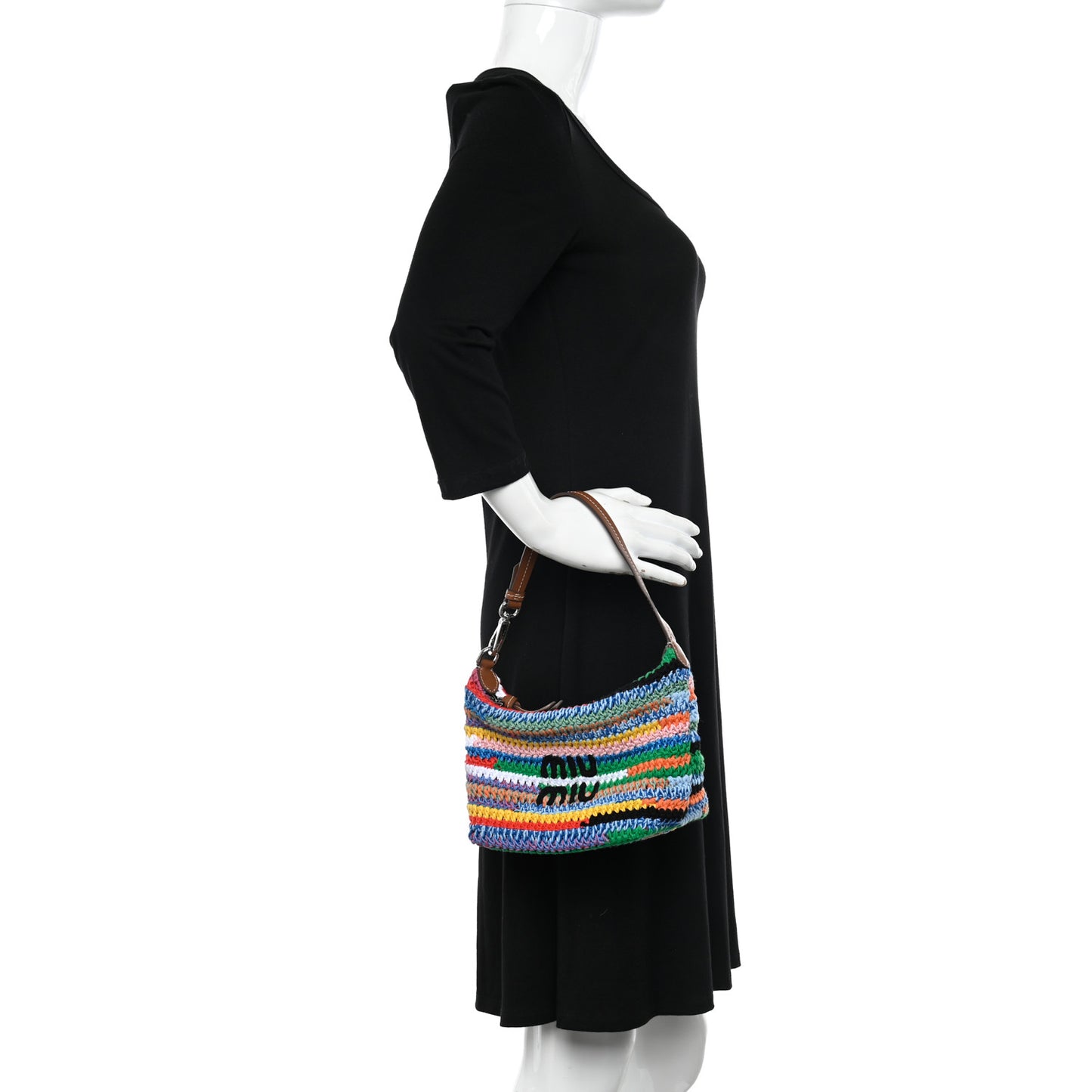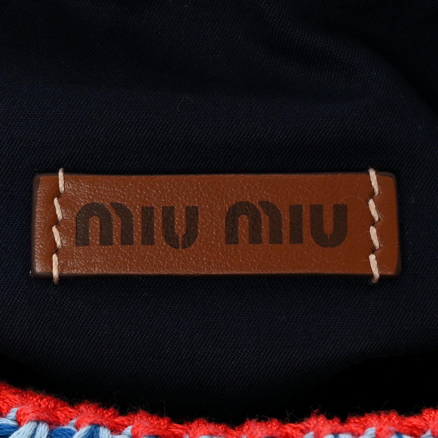 This is an authentic MIU MIU Fabric Crochet Pouch in Multicolor. This handbag is crafted of multicolor knit fabric. The bag features a brown leather handle with a snap-hook. The top zipper opens to a dark blue fabric interior.Follow this item for alerts. Miu Miu is a registered trademark of Miu Miu. FASHIONPHILE is not affiliated with Miu Miu.